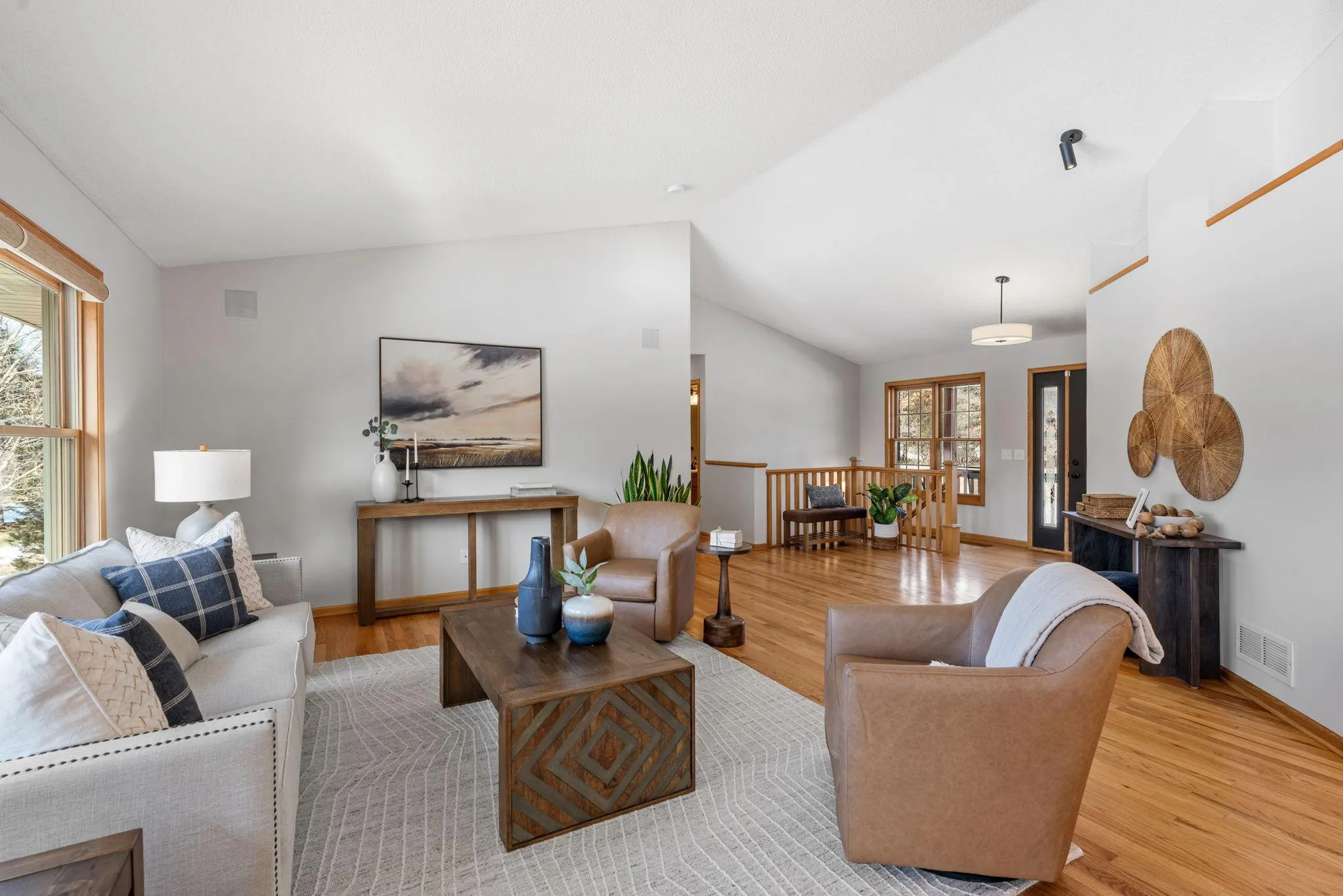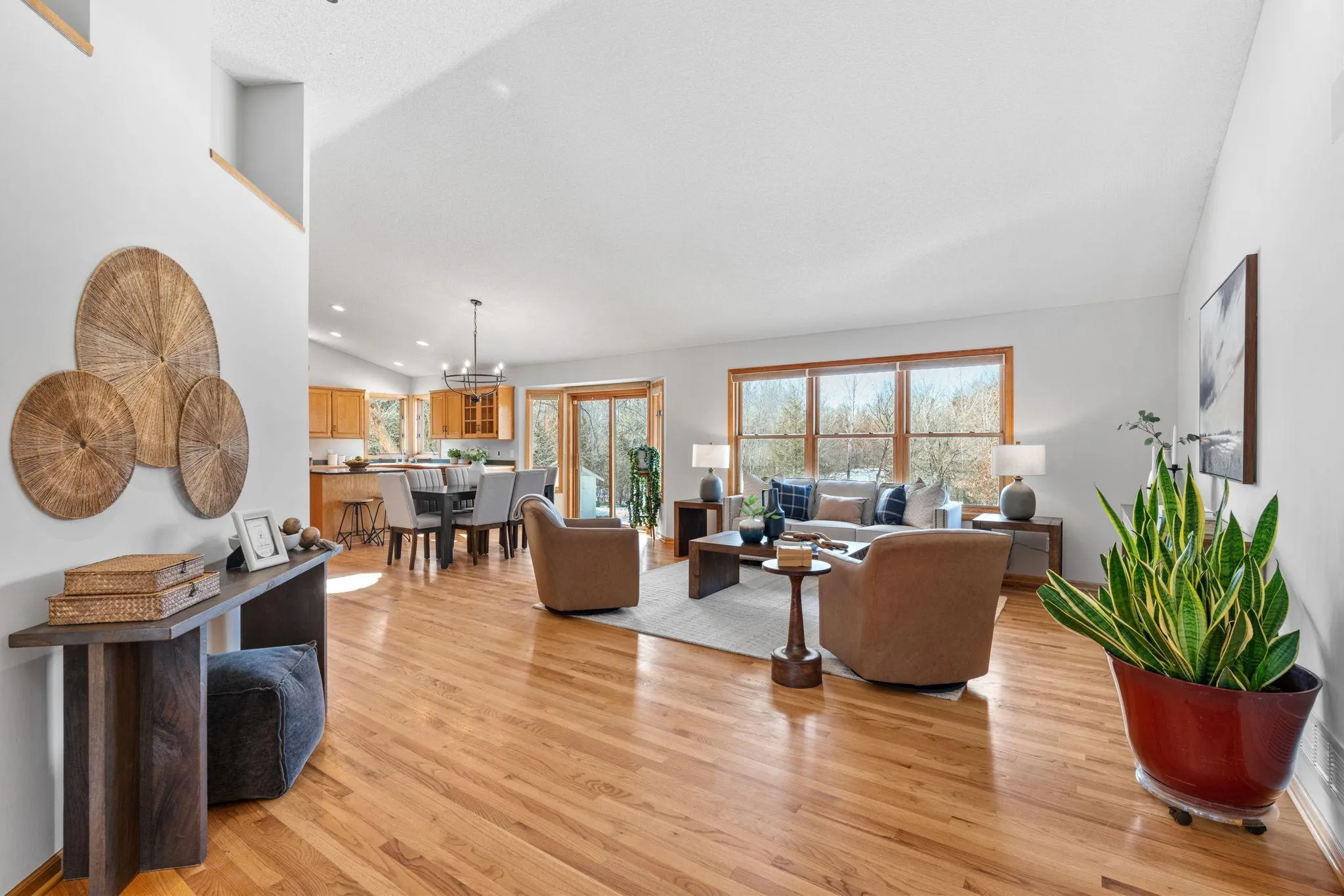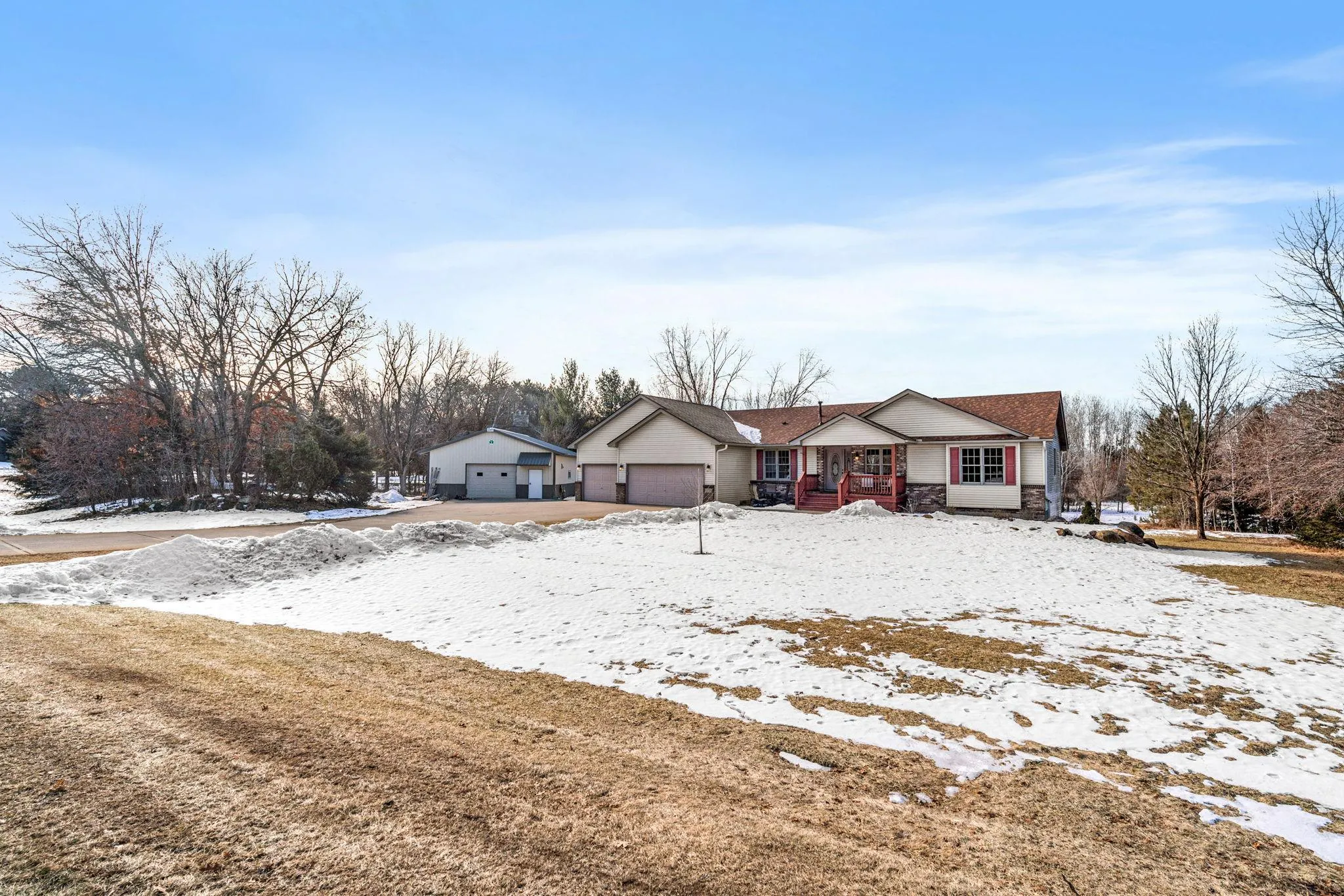 Set on nearly three private acres, this beautifully refreshed one-story home offers space, flexibility, and thoughtful updates throughout. Vaulted ceilings and expansive views welcome you into an open main level designed for connection and ease. Fresh paint, new carpet, and updated lighting create a crisp, move-in-ready interior. The primary suite, additional bedroom and bath, and convenient main-level laundry—just off the insulated three-car garage—support effortless daily living. The walkout lower level features in-floor heat in the family room, two additional bedrooms, a ¾ bath, and a bonus room ideal for an office or craft space. Built-in speakers throughout the home and outdoors enhance entertaining. A fully insulated 30×32 outbuilding with in-floor heat expands the possibilities. Solar panels, plus a new furnace and AC (2025), add long-term efficiency to this exceptional acreage property.