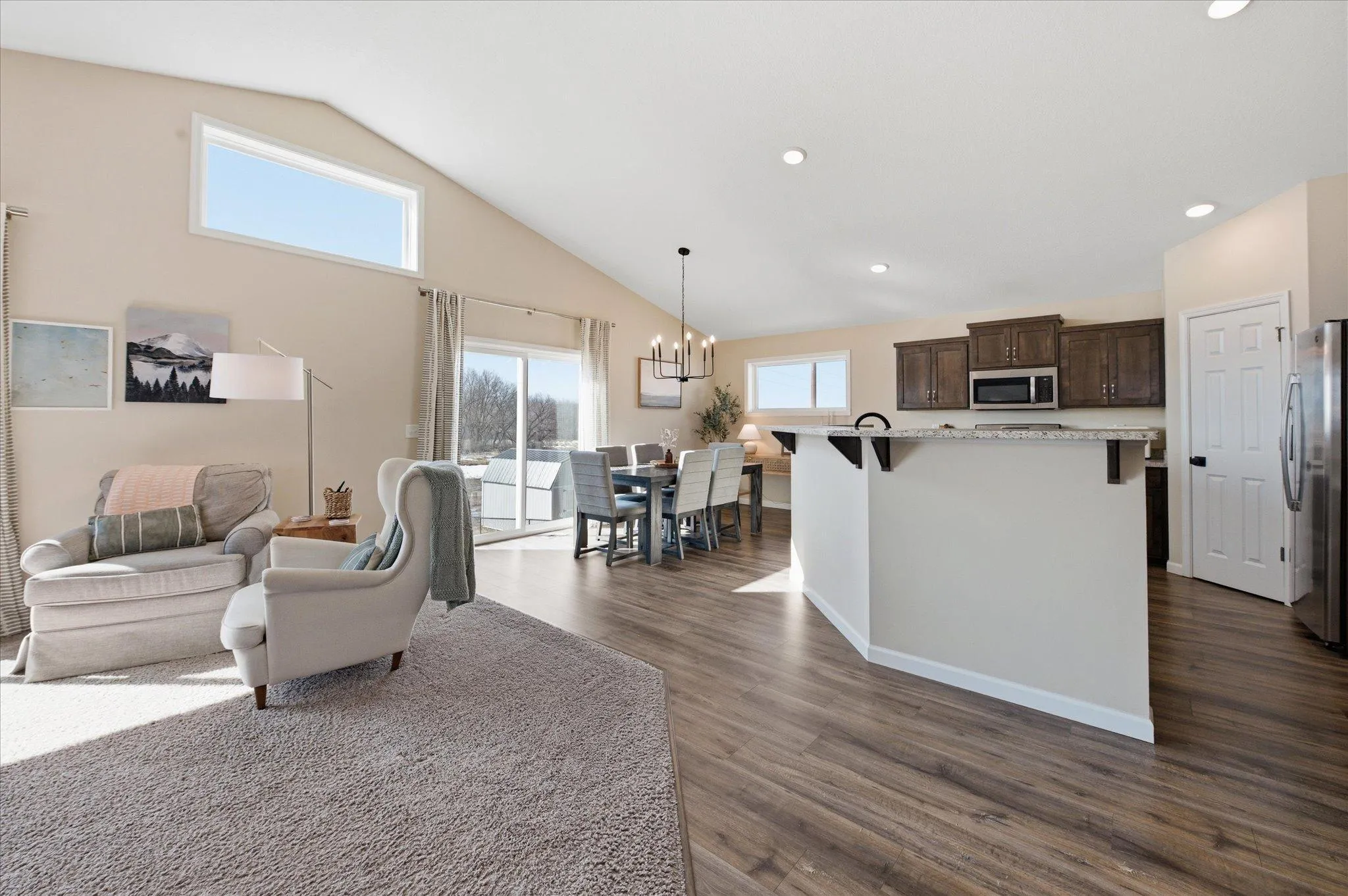 Experience modern living in this stunning 2022-built home. Defined by an open-concept design and soaring vaulted ceilings, the interior is bathed in natural light through a series of expansive windows that frame panoramic views. The “cook”-inspired kitchen is a show stopper, featuring granite countertops, a large center island, and a walk-in pantry. An abundance of cabinetry for multiple uses. Retreat to the spacious primary suite with its spa-like bath with separate tub and shower. Total Four bedrooms and three baths provide the perfect living space for any lifestyle. Enjoy the versatile walkout lower level—perfect for a home theater/recreation/relaxation. With a three-stall garage, concrete driveway, in-ground irrigation, vinyl/metal exterior, every detail offers minimal maintenance. Located in a wonderful neighborhood close to parks and schools.