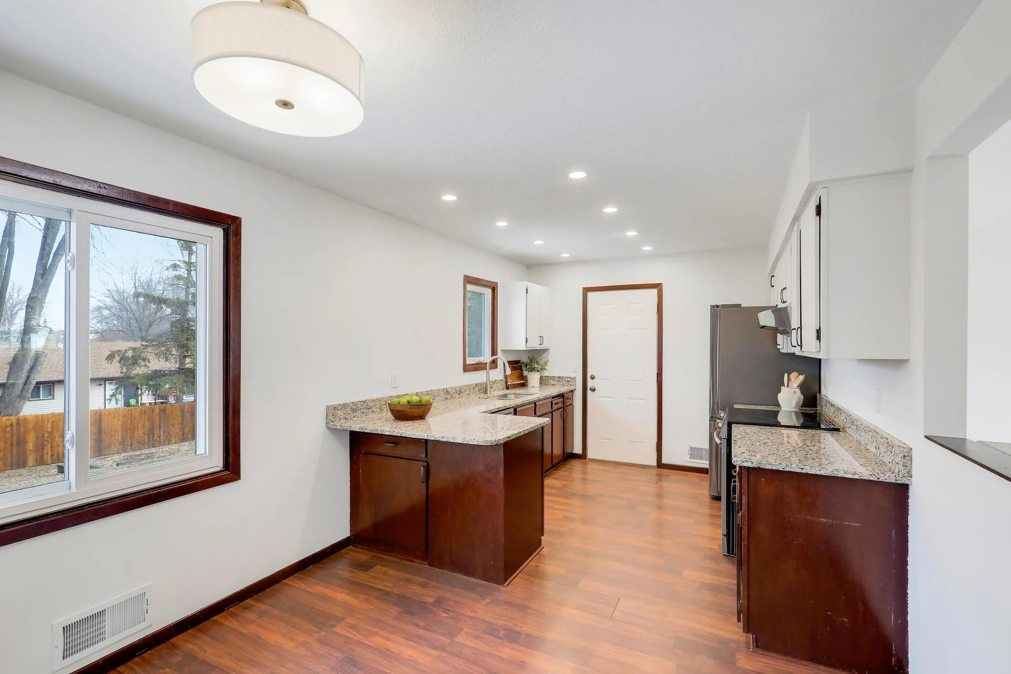 The freshly painted main level features a welcoming living room filled with natural light and a kitchen complete with stainless steel appliances, granite countertops and recessed lighting.