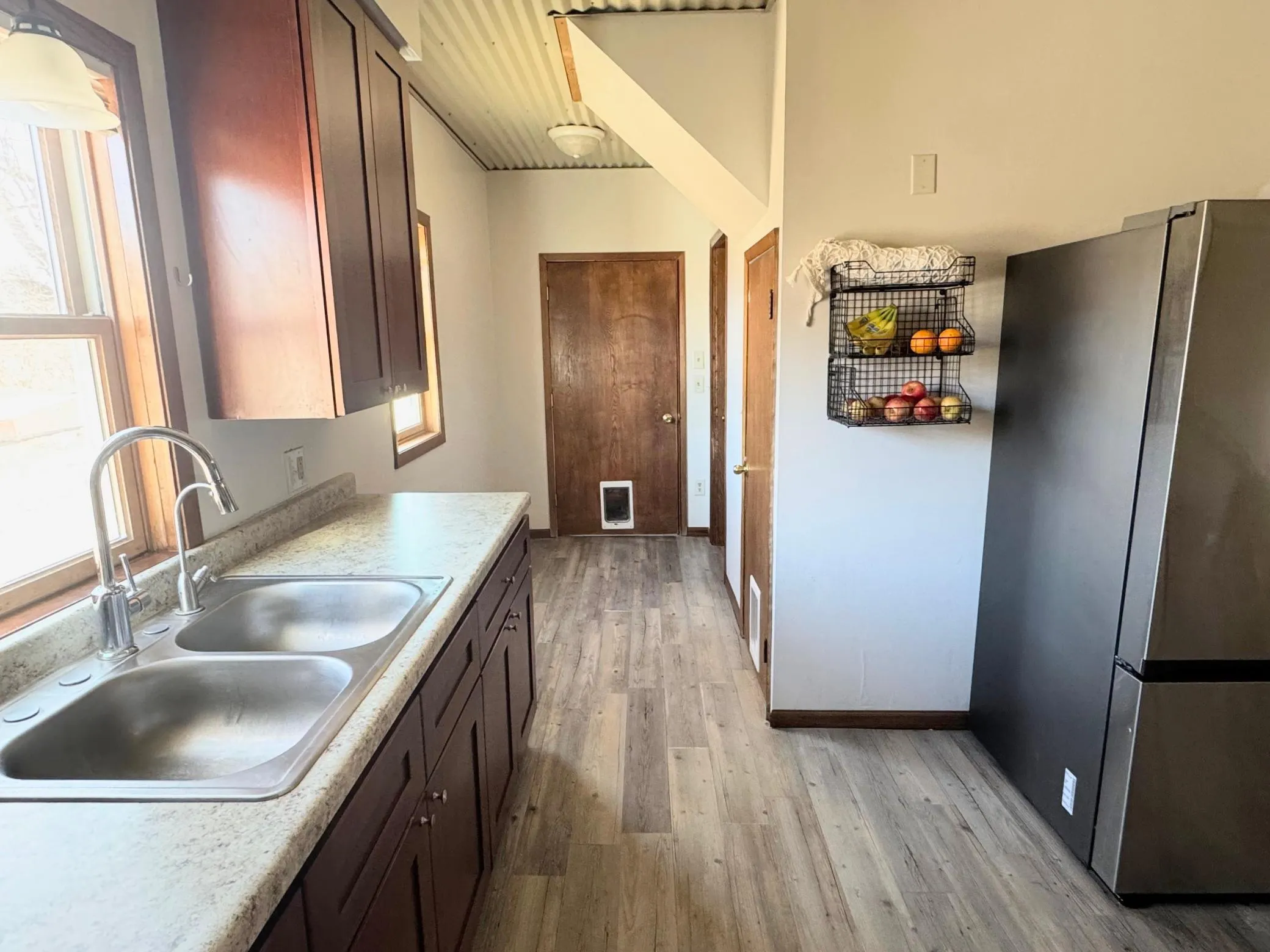 Inside, you’ll find high ceilings and a large, light-filled living room with abundant windows that create a bright and welcoming atmosphere. The dining area features a large picture window with beautiful views of both sunrises and sunsets. The kitchen includes dedicated pantry space for added storage and organization.