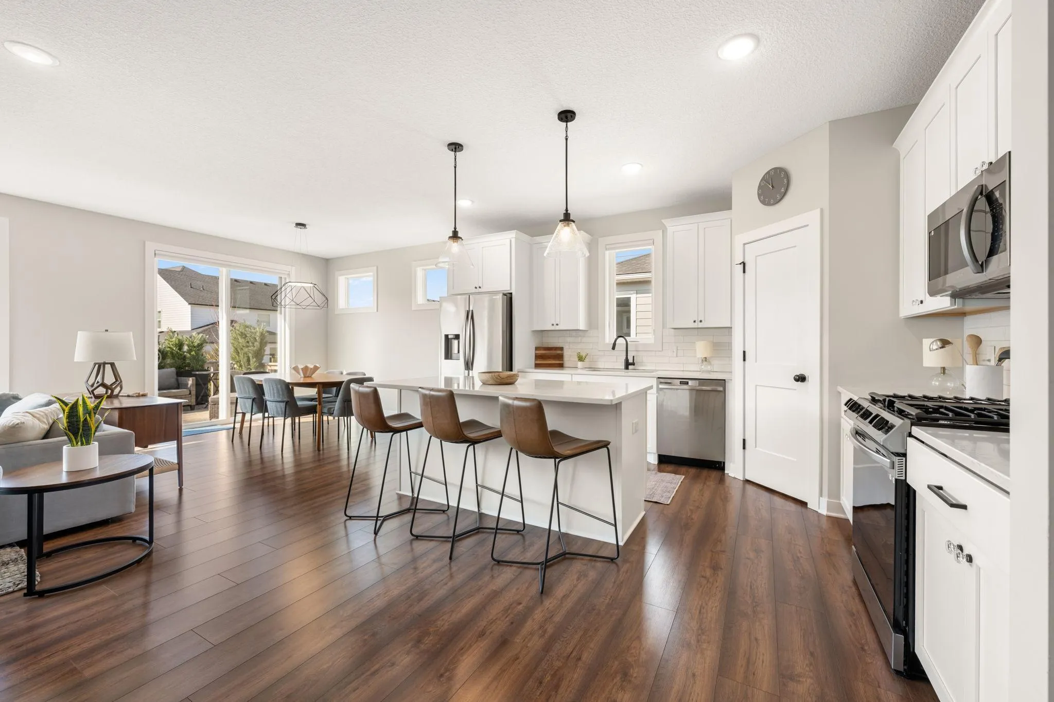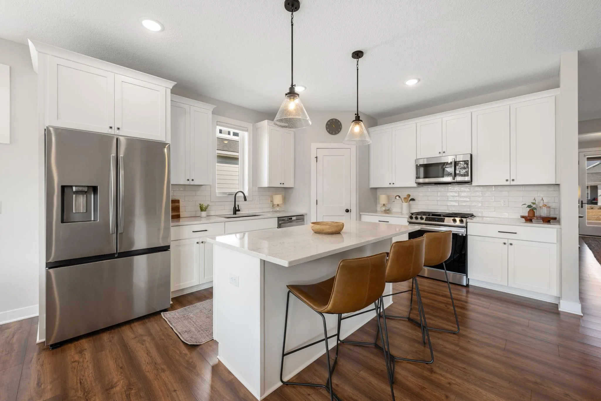 Inside, enjoy 9’ main-level ceilings, designer lighting, quality millwork, and an open layout ideal for everyday living and entertaining. The kitchen showcases quartz countertops, stainless steel appliances, full-overlay cabinetry, and a large center island, while bathrooms feature quartz vanities and Kohler fixtures for a timeless feel. Built for comfort and efficiency with a high-efficiency dual-zone furnace, spray foam insulation, air exchanger, Energy Star certification, and independent HERS testing.