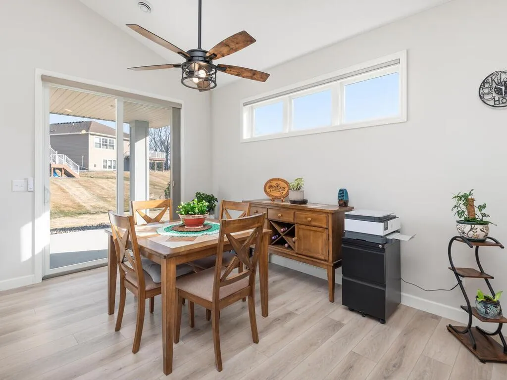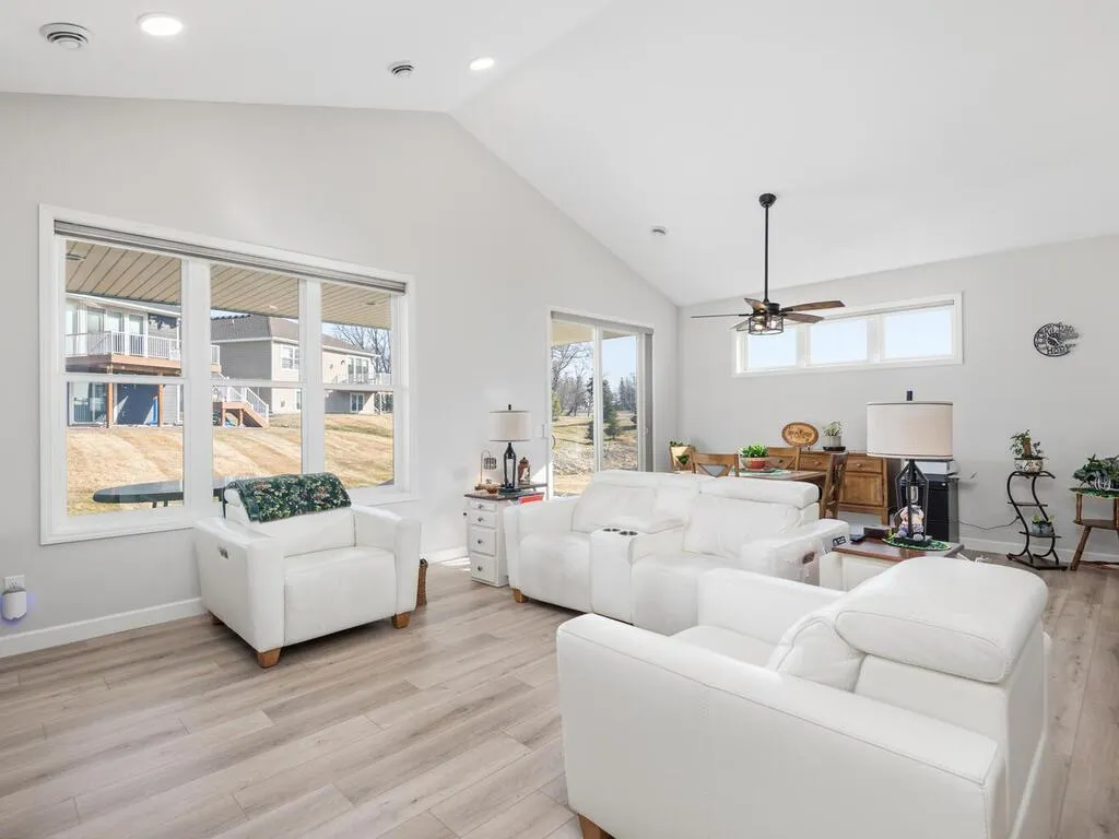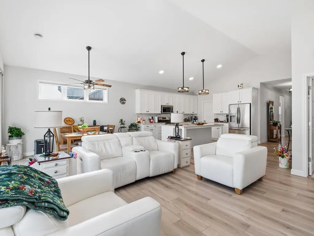 Beautiful one-level detached townhome with vaulted ceilings and an open-concept layout filled with natural light. The spacious kitchen features quartz countertops, abundant cabinetry, and a huge center island, along with a 6’x7’ pantry offering exceptional storage. Luxury vinyl plank flooring runs through the living, kitchen, dining, and entry areas. The living room includes a cozy gas fireplace, while recently added modern light fixtures and electronic blinds provide stylish updates throughout. Enjoy relaxing on the covered front and rear porches, and appreciate the extra storage provided by the oversized garage. Hard-to-find one-level living with thoughtful design and modern finishes.