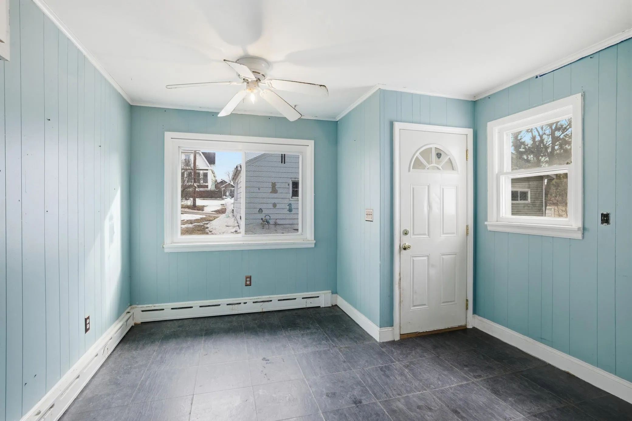 Three bedroom home situated on a double corner lot in Eveleth with a two-stall detached garage. The property offers hardwood floors, natural woodwork, and a large upper-level bedroom area. Main level layout includes living room, kitchen/dining area, bedrooms, and bath, with a full unfinished basement for storage and utilities. Convenient in-town location near schools, parks, and services. Property is being sold as-is.
