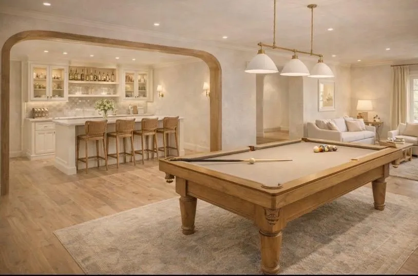 The home was designed with an organic, high-end aesthetic, featuring natural materials, warm textures, and timeless architectural elements. Planned spaces include a stunning open-concept kitchen anchored by a Taj Mahal quartzite waterfall island, custom white oak cabinetry and millwork, luxury appliances, and a statement plaster hood over a professional-grade range.