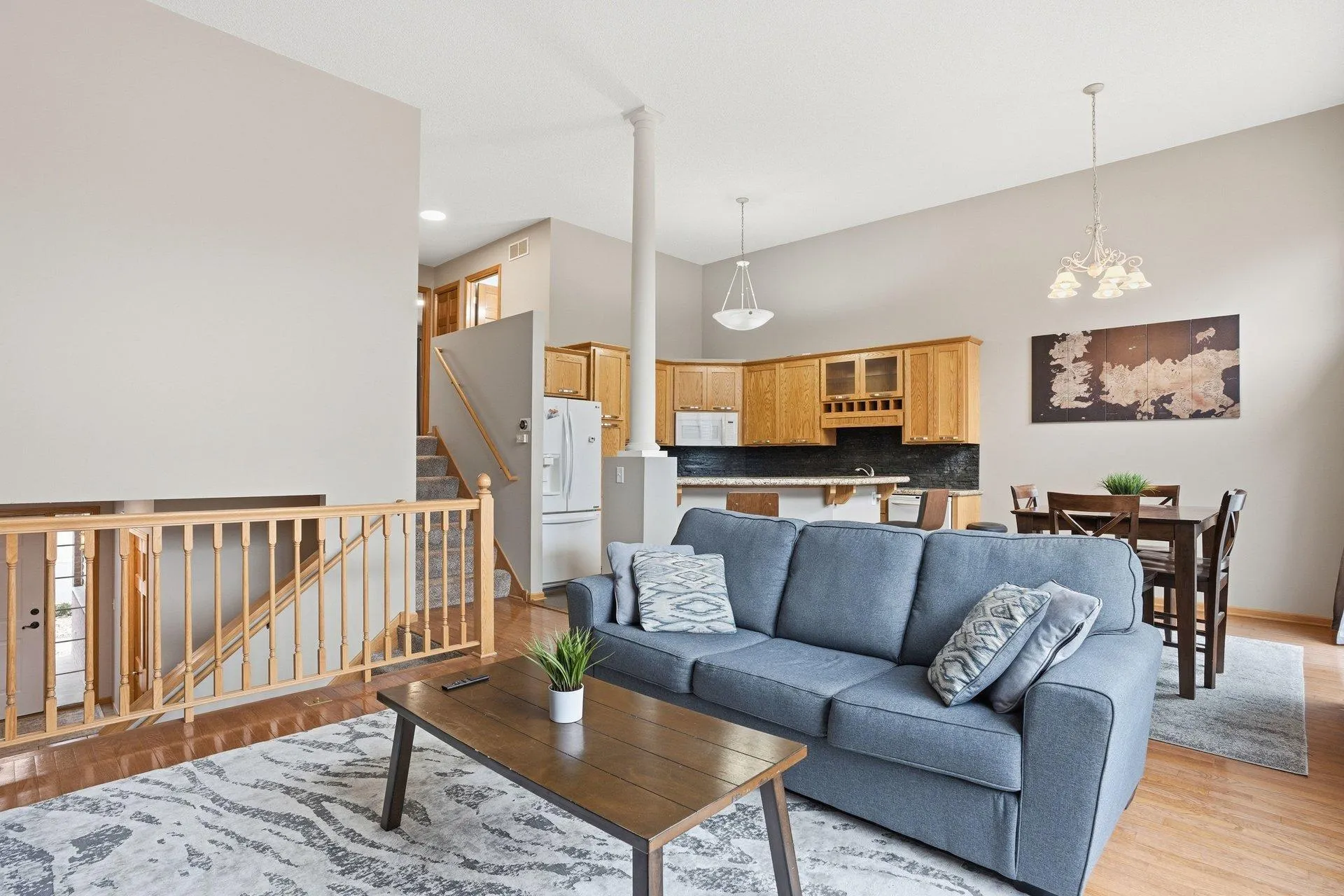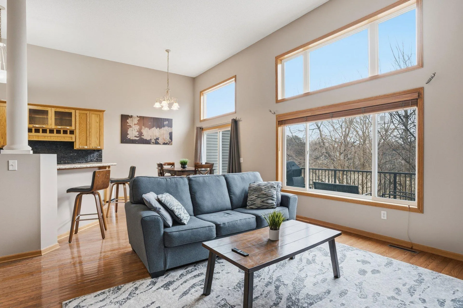 Beautifully updated home with PANORAMIC NATURE VIEWS and thoughtful upgrades throughout. The main level features 12-FOOT VAULTED CEILINGS, rich wood floors, and an open layout filled with natural light. The UPDATED KITCHEN offers custom cabinetry with large pull-out drawers, tile backsplash, stone countertops, under-cabinet lighting, wine rack, gas range, and a center island with bar seating. The kitchen opens to the dining area with patio doors leading to a HUGE MAINTENANCE-FREE COMPOSITE DECK with new railings overlooking peaceful preserved land. Upstairs are two bright bedrooms and two full bathrooms. The PRIMARY SUITE features a vaulted ceiling, walk-in closet, and private EN SUITE BATH with double sinks, soaking tub, and separate walk-in shower. The WALK-OUT LOWER LEVEL includes a large family room with a cozy GAS FIREPLACE and patio doors leading to a concrete patio with the same beautiful nature views. This level also offers a THIRD BEDROOM and a 3/4 bathroom, perfect for guests or a home office. The SHEET-ROCKED