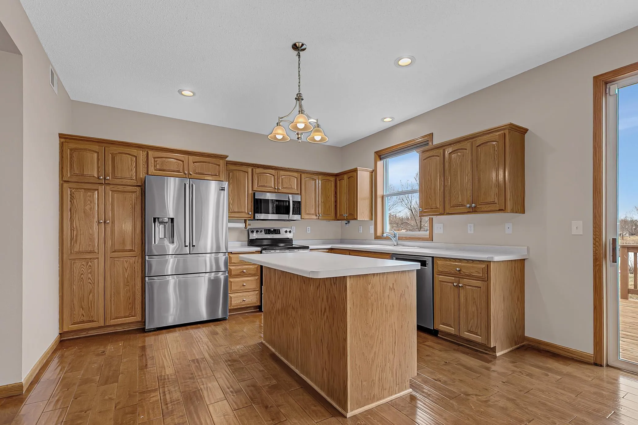 Inside, the home blends timeless finishes with thoughtful updates. The kitchen features custom raised oak cabinetry with hidden hinges, stainless steel appliances, and a center island with additional storage and a built-in outlet, ideal for both everyday living and hosting. Throughout the home you’ll find solid six-panel oak doors, while hand-scraped hardwood floors add warmth and character across the foyer, dining room, kitchen, main level half bath, laundry room, and closets. Much of the interior has been freshly painted, and new carpet has been installed wherever carpet is present.