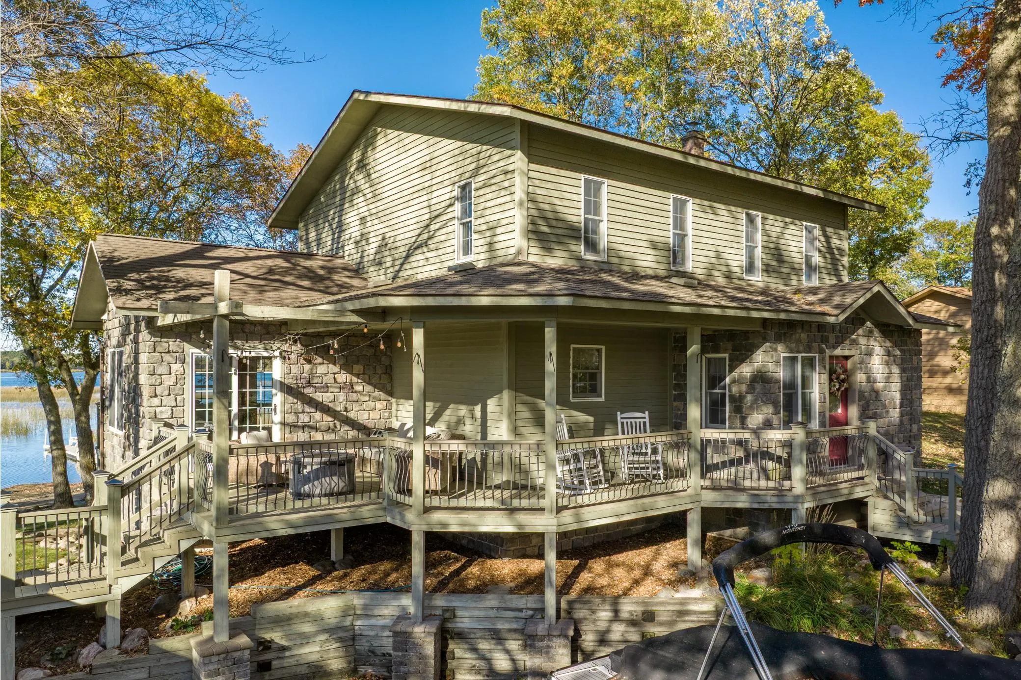Experience sophisticated lakefront living on this spacious 1-acre property with 110 feet of pristine sand shoreline and a stunning mix of mature hardwoods. This Baxter home showcases exceptional craftsmanship and thoughtful design throughout. The gourmet kitchen features granite countertops and updated lighting, flowing seamlessly into the open living area with panoramic lake views. Enjoy indoor–outdoor living with expansive decks front and back, plus a private balcony off the primary suite. The primary suite includes a private bath and walk-in closet, while the walkout lower level offers versatile living space perfect for a den, office, or exercise room.