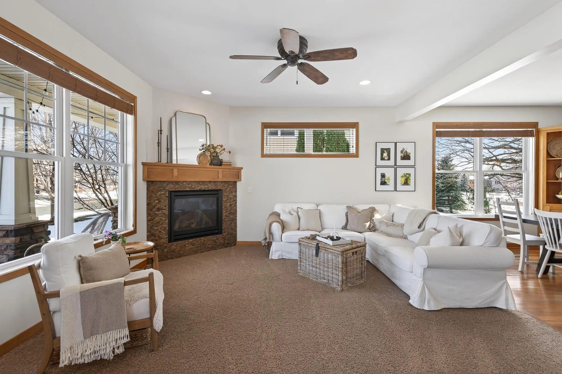 Stepping down into the fully finished lower level . . . You will love the 2nd Family room surrounded by South & West Facing sunny windows while you enjoy the 2nd gas fireplace and dry-bar with drink fridge & cabinetry for wonderful gatherings & movie nights!