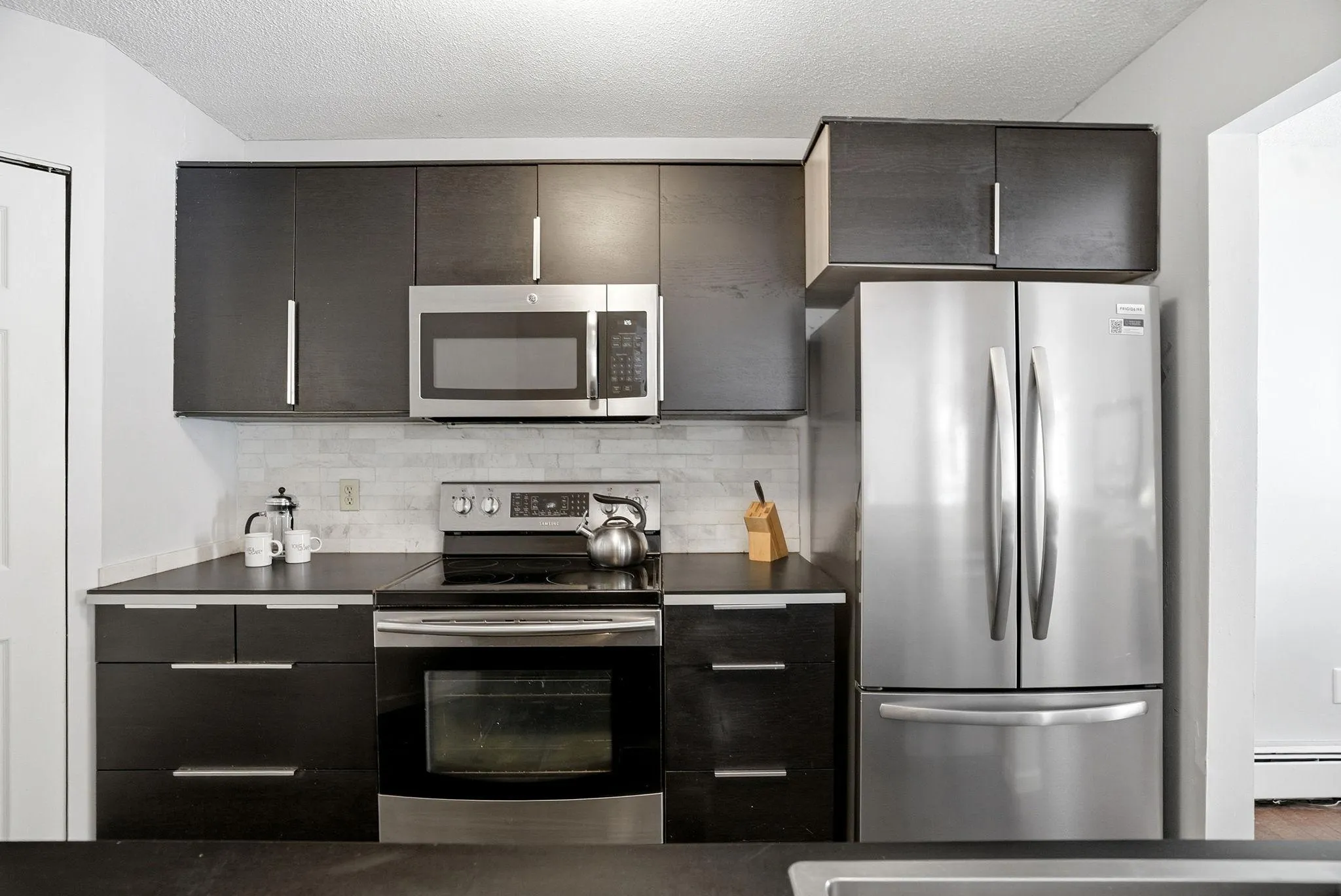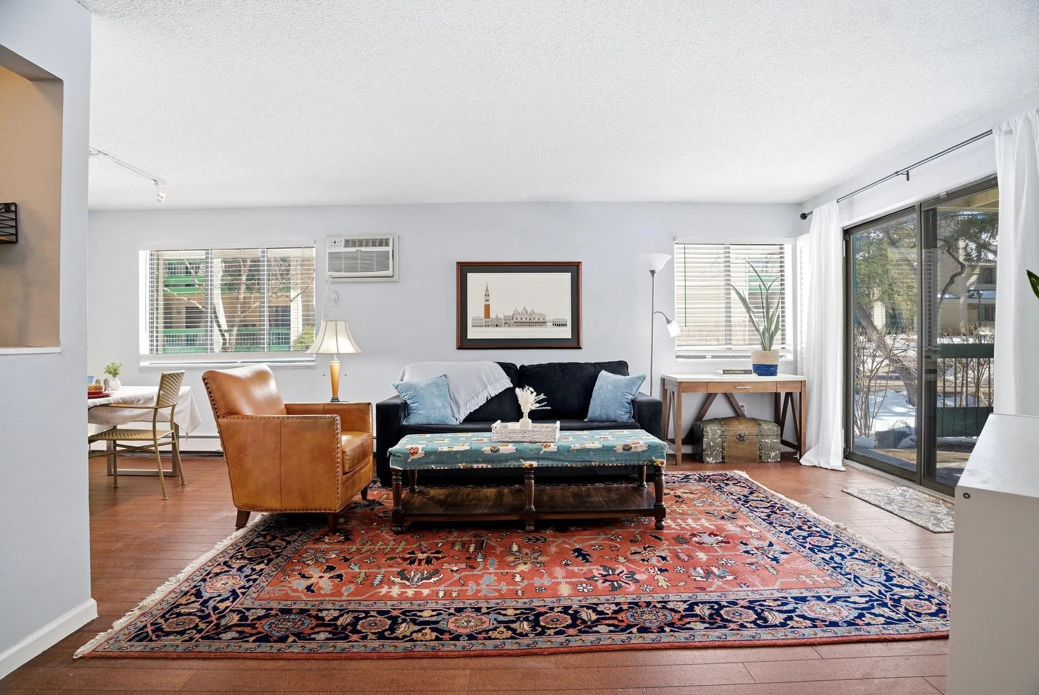 All living on one level with a walkout patio provides easy accessible entry. Beautiful two-bedroom, one-bath home in a highly desirable Edina location. The modern kitchen features sleek black cabinetry, slate countertops, and an open layout that flows seamlessly into the dining and living areas—ideal for both everyday living and entertaining.