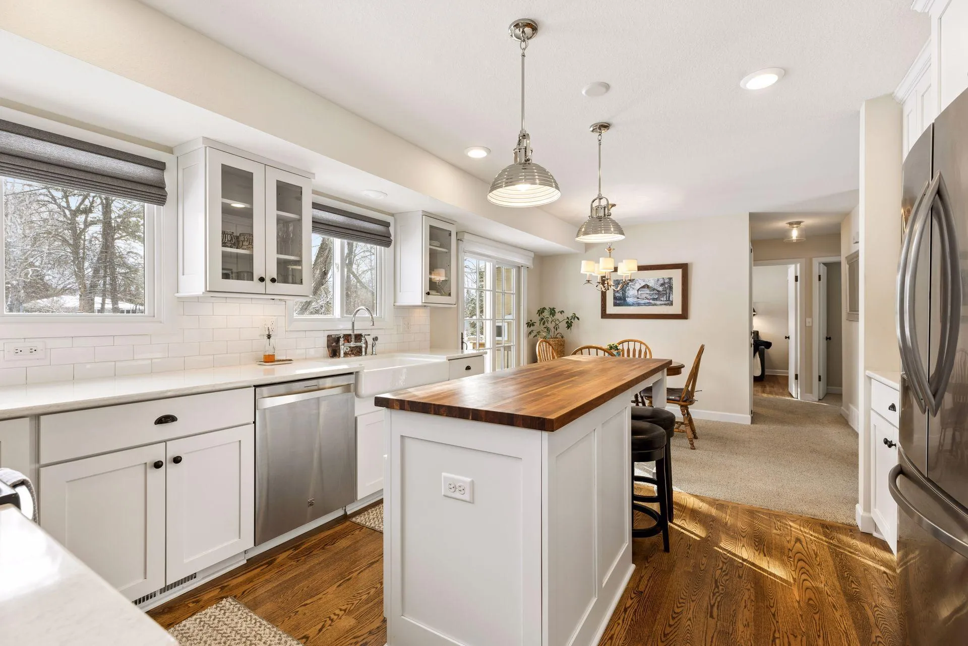First time available since 1990! 1516 Boone Ave N has been steadily upgraded over the years. Spectacular kitchen and bathroom renovations are the centerpieces of this tasteful 3 bedroom home in a quiet neighborhood, surrounded by nature and parks. The spacious kitchen open features custom cabinetry with dove tailed wood drawers, sliding shelves, Cambria counters with a butcher block center island, Farm house sink, under cabinet lighting, Kenmore stainless steel appliances, all over oak hardwood floors. The fresh bathroom remodel features a custom vanity with Cambria counter with white hex tile tile floors and a glass shower door to show the stunning robins egg blue subway tile shower. The living room opens to the dining room and kitchen. Three main level bedrooms, each with closet organizers for convenience. The main floor carpet has been preserving the original hardwood (under) for many years! The basement offers fresh carpet, paint and lights and offers space for a new bathroom, if desired. Outside the sliding dining room door, a paver patio opens to the large flat yard with mature maple trees for shade. Siding, roof, windows, doors and HVAC are all updated. Hunter Douglas and Smith & Noble shades. The oversize one car garage gives ample storage and the shed adds space for yard equipment. Lawn / snows / garden equipment included and the home can be sold furnished. Nature trails across the street with a full park just down the hill – all within five minutes of downtown Golden Valley. // Listing agent related to seller.