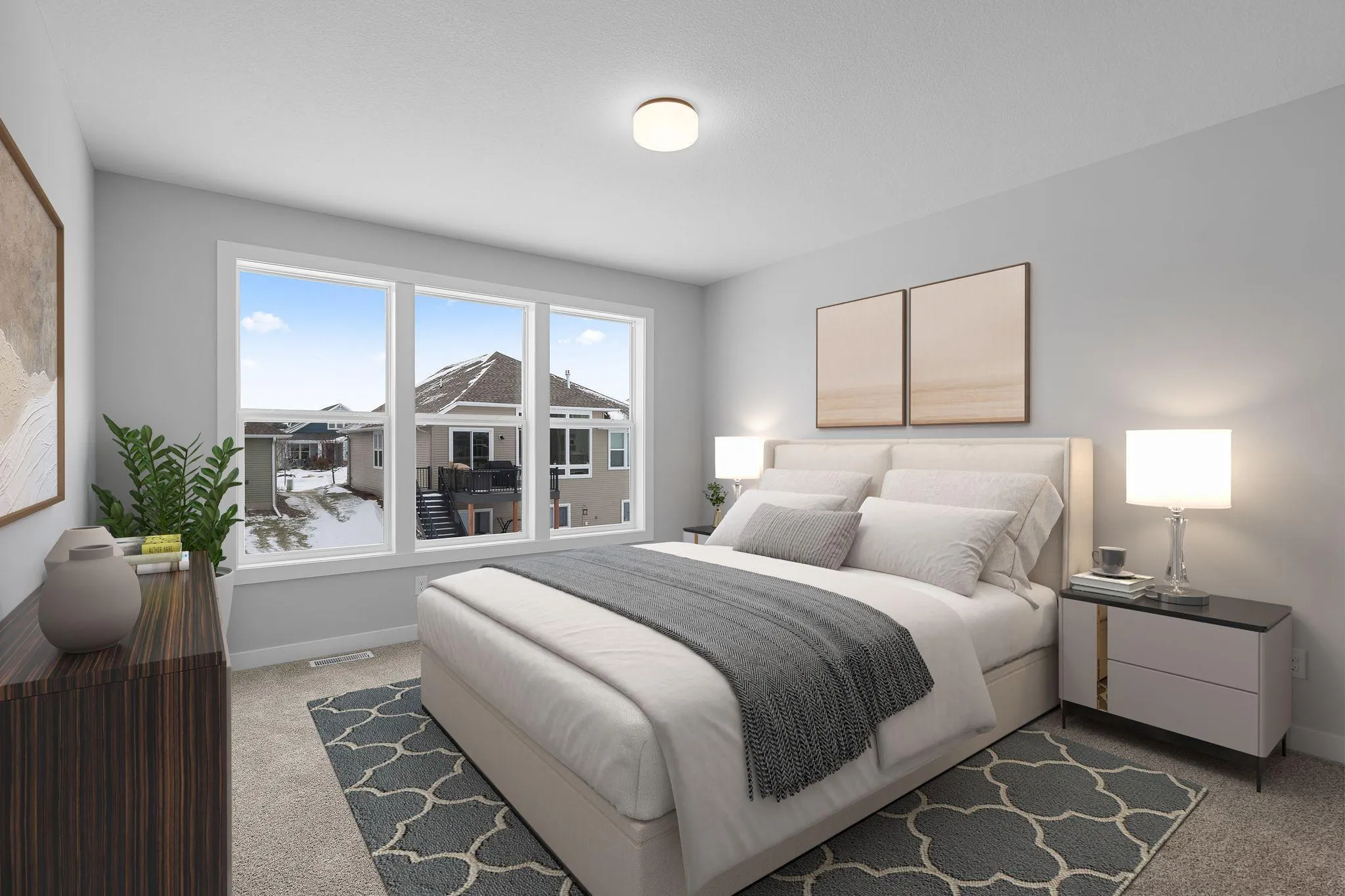 Completed New Construction! This three-bedroom home is situated on a desirable corner lot in Lake Elmo and offers a well-planned layout with two bedrooms on the main level and one in the fully finished walk-out basement. The open-concept main level features a gourmet kitchen with a gas cooktop, built-in wall oven and microwave, and a tiled backsplash, along with an open railing and a main-level fireplace that adds warmth and character to the living space.
