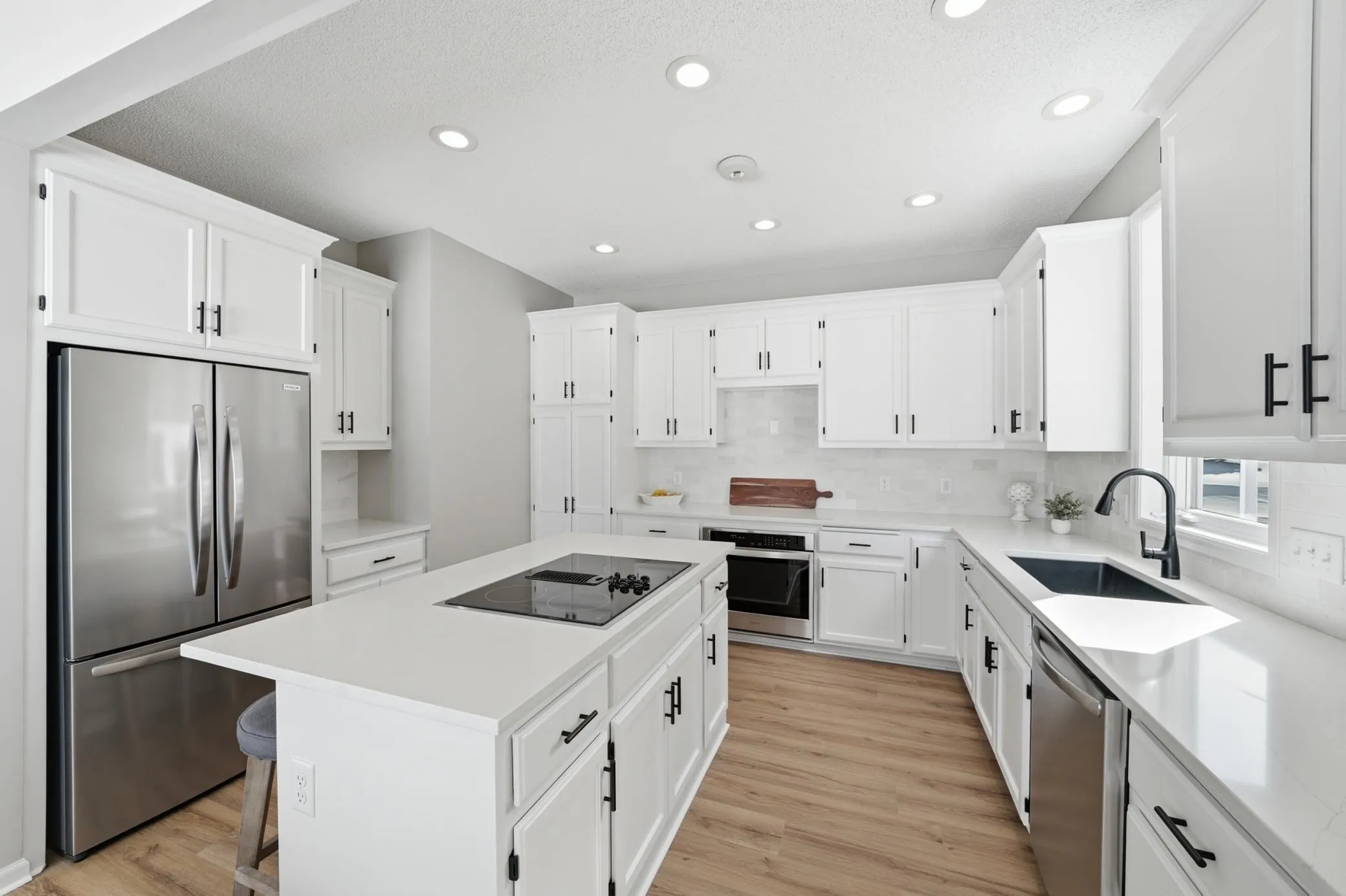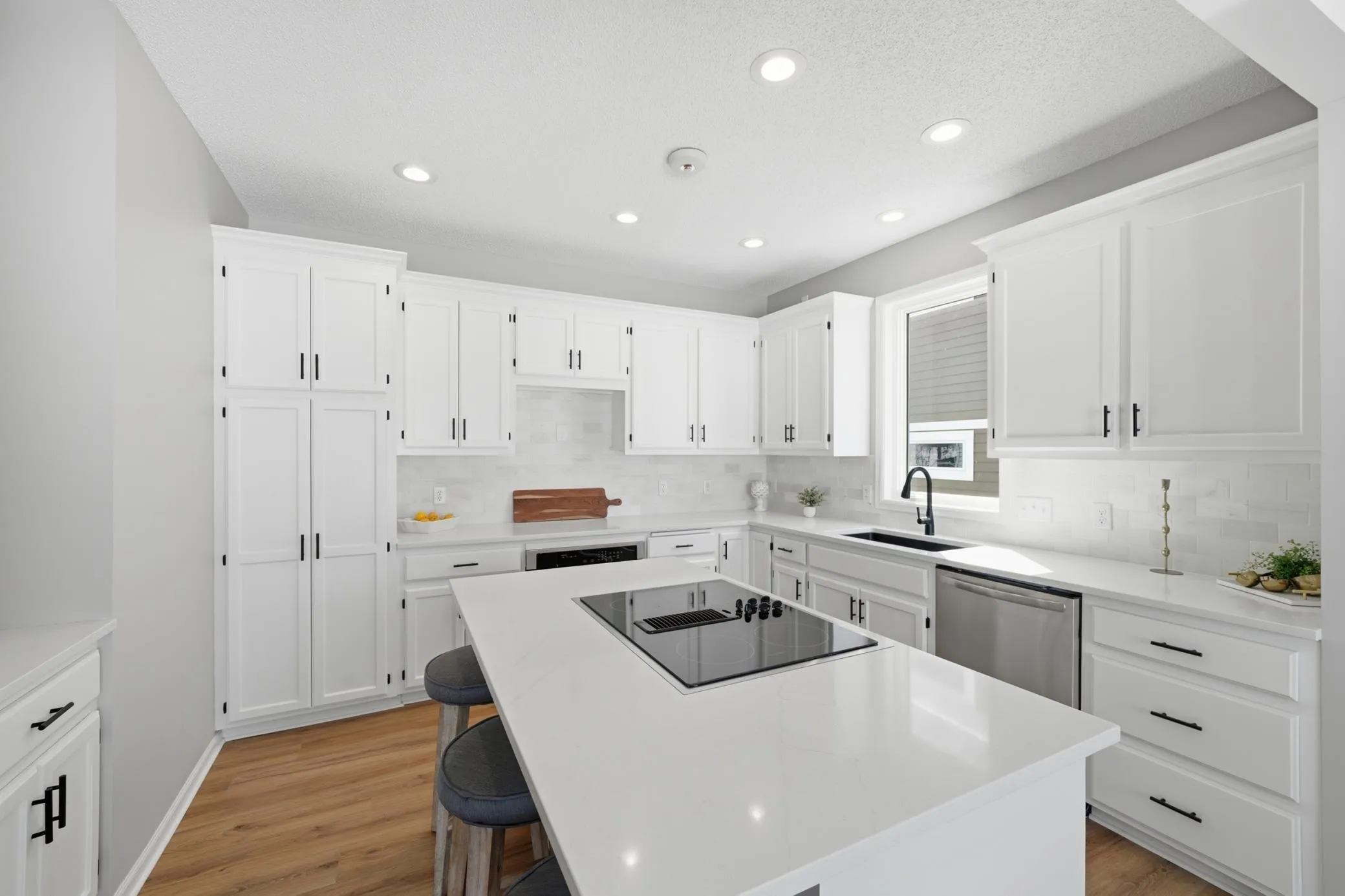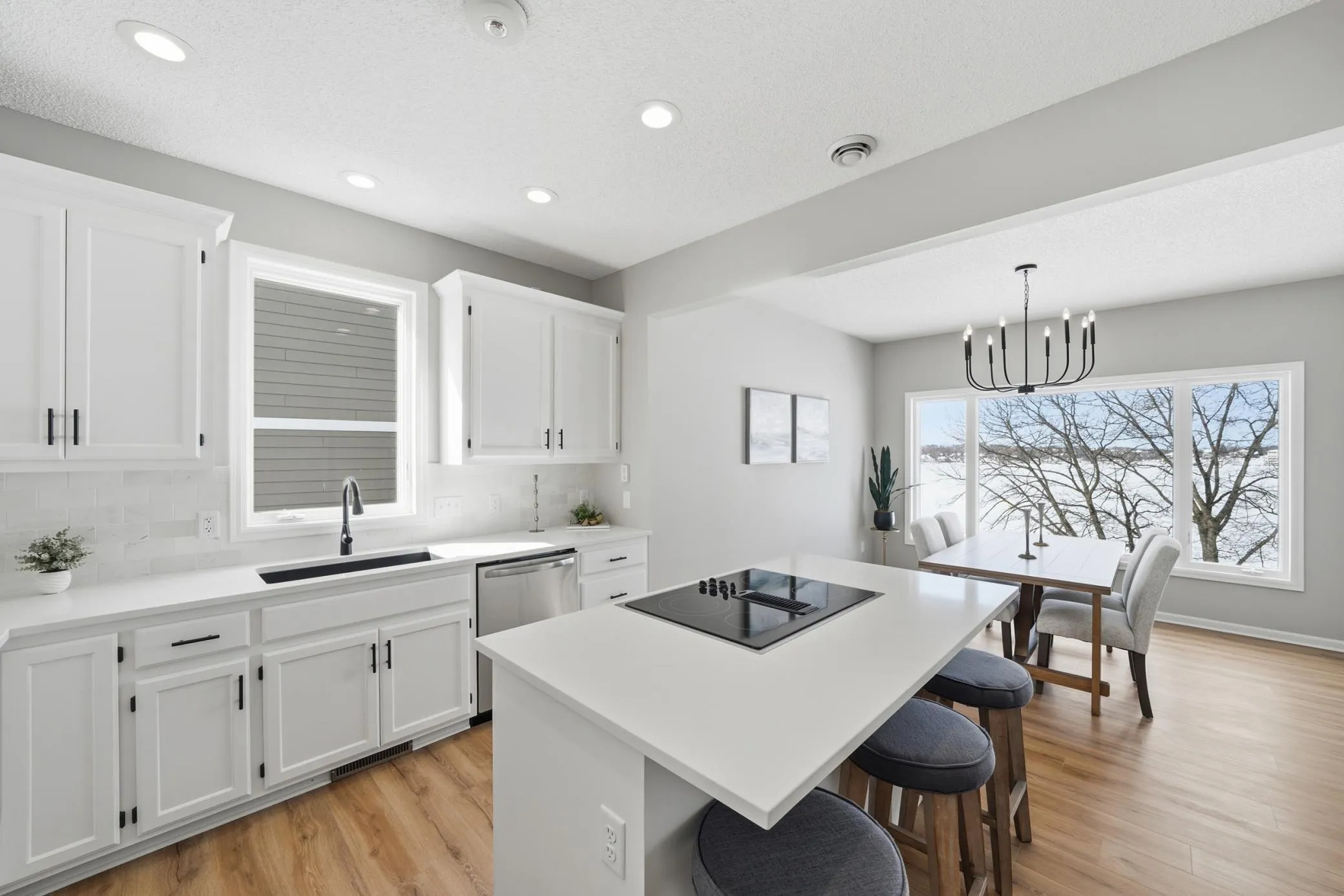 This beautifully updated Prior Lake home boasts 50 feet of sandy shoreline and sweeping lake views from nearly every room. The vaulted entry welcomes you with warm wood flooring that flows through the open main level. A spacious living room features custom built-ins, a cozy gas fireplace, and expansive windows opening to a lakeside deck—perfect for relaxing or entertaining. The kitchen is a showstopper with crisp white cabinetry, stone countertops, stainless steel appliances, tiled backsplash, and a center island with cooktop. An adjoining dining area makes every meal feel special with lake views as the backdrop. Upstairs, the private primary suite is a true retreat—double French doors open to a bright sitting area with new carpet, an ensuite ¾ bath with dual vanity, and a private balcony overlooking the water. A second bedroom, full bath, and open loft provide flexibility for family, guests, or a home office. The walkout lower level extends the living space with a family room and fireplace, an additional bedroom and bath, and a spacious laundry/mudroom—all designed to capture lake views. Outside, enjoy your own sandy beach, dock, and boat lift—easily accessed by stairs or a private lift. Just minutes from lakeside dining at Charlie’s on Prior and the heart of downtown Prior Lake, this home offers an unbeatable blend of luxury, location, and lifestyle.