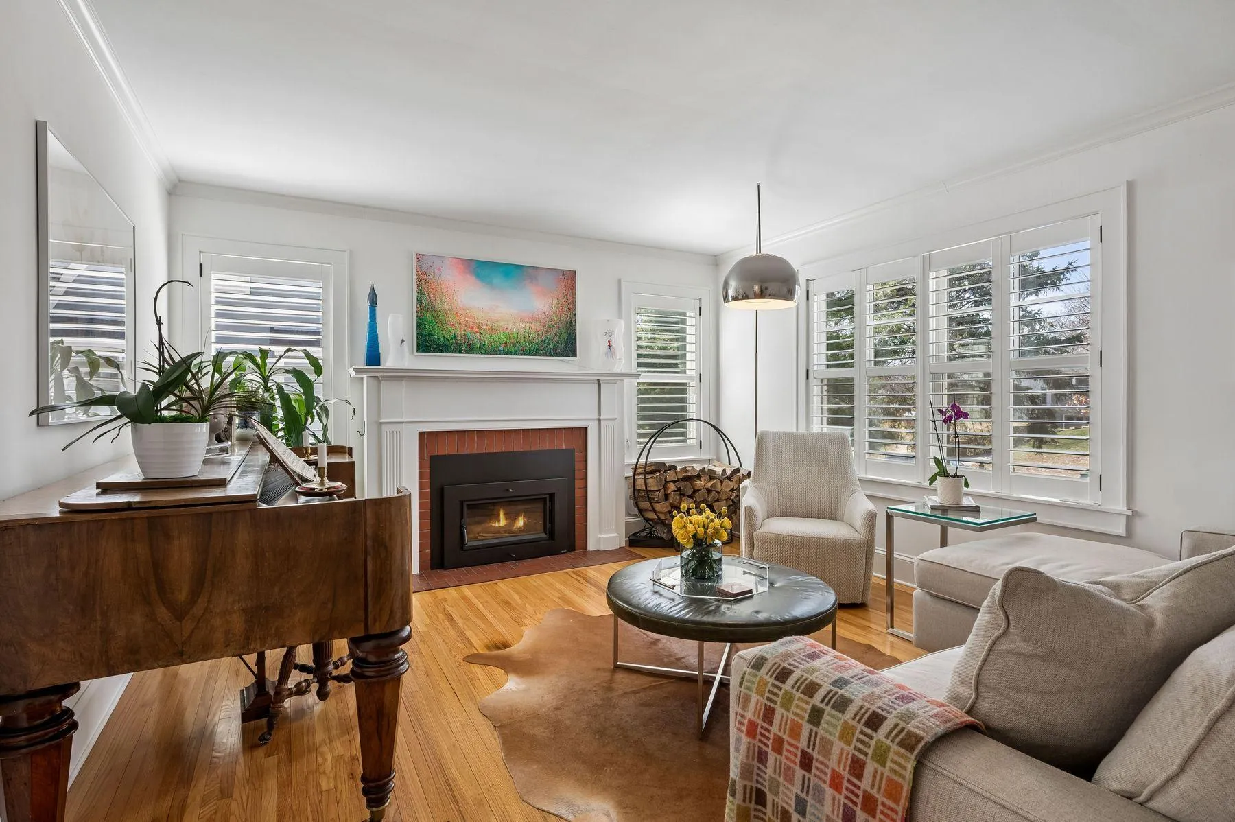 improvements. Enjoy the home’s original 1940s character, with its timeless white trim, hardwood floors, arched dining room entrance, and central fireplace. The engineer-designed driveway with a dog-safe fence leads to the large 22′ x 24′ two-car garage, wired for two electric vehicles. The fitness area, complete with padded flooring and an infrared sauna, is sure to impress wellness enthusiasts, while the bar in the basement family room is perfect for an impromptu happy hour. The newer backyard patio, with a privacy screen and room for both dining and lounging, echoes the attention to detail found inside the home.