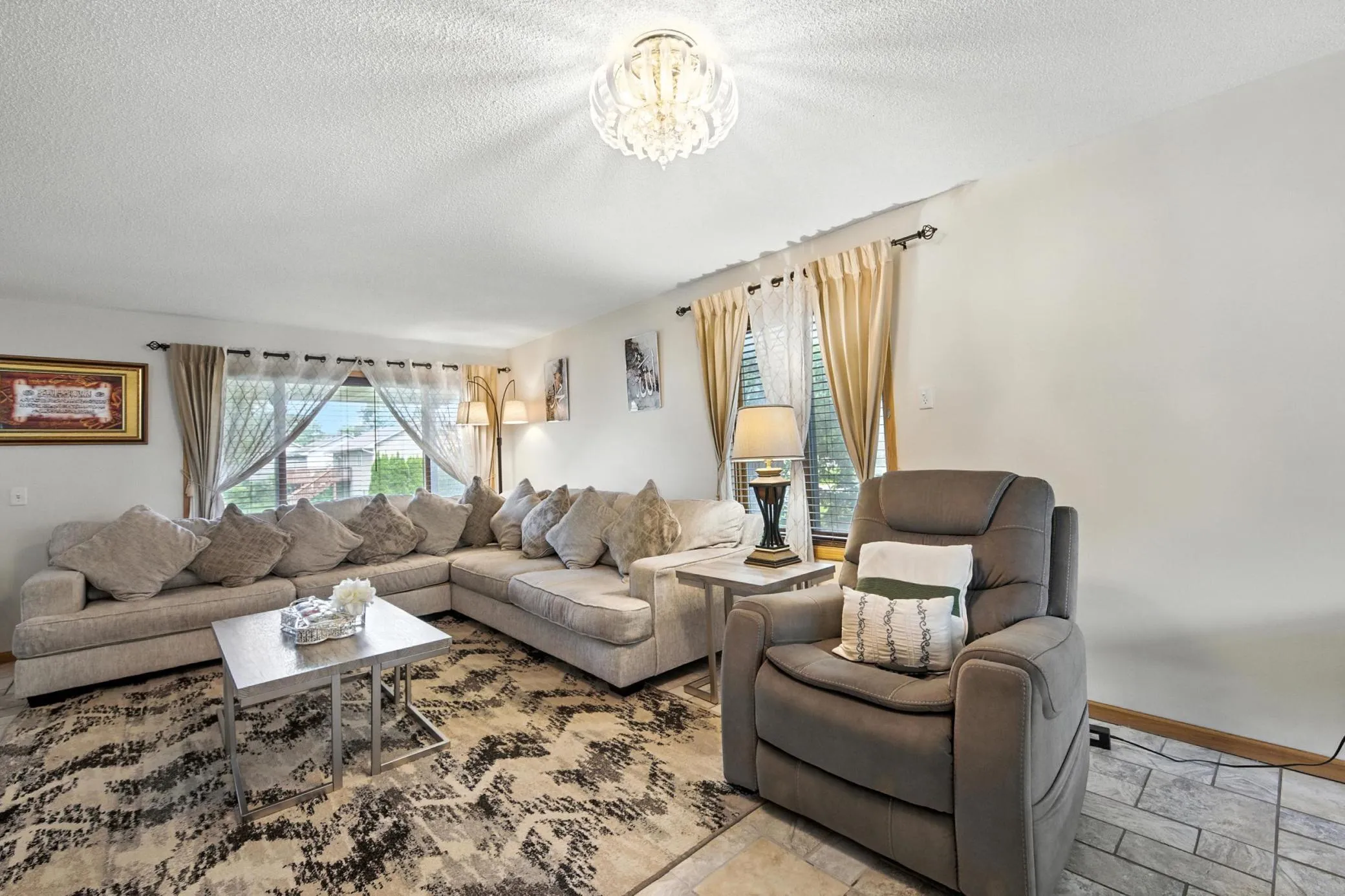 2 story home with lots of living space. large eat in kitchen, living room & sun room. 3 bedrooms up plus either nursery or an office attached to owner bedroom. Granite counters, SS appliances. Finished lower level. 4 car garage-2 stalls heated. fenced yard. Easy access to highways.