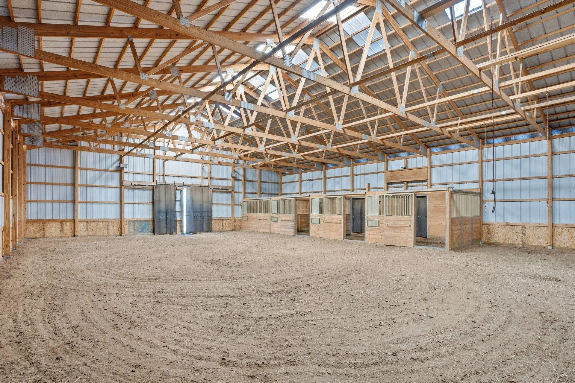 Experience the freedom of country living in this stunning custom log home set on 12.7 private, tree-lined acres. Tucked among mature trees with open pastures and wide skies, this property offers the kind of space and serenity that’s increasingly hard to find — whether you envision a fully equipped horse setup, hobby farm, recreational retreat, or simply room to breathe. Designed with equestrian living in mind, the land is thoughtfully arranged with fully fenced pastures, automatic waterers, eight stalls, and two dedicated tack rooms — truly move-in ready for horses. Two impressive pole buildings provide exceptional flexibility: an 80×50 Morton barn with 30-amp RV hookup and a 50×30 secondary building with water, electricity, lighting, and concrete floors. Store trailers, equipment, recreational vehicles, or create workshop space — the possibilities here are extensive. A third garage and an extra-deep attached two-car garage with a wood-burning stove add even more functional space for projects, storage, or year-round use. Inside, the home blends rustic character with comfortable living. The loft-style primary bedroom offers a bright, open retreat overlooking the home’s main living space. It currently embraces an airy, open-concept design, but also provides the opportunity to easily add a wall and door for enhanced privacy if desired — allowing you to tailor the space to your lifestyle. The primary bathroom features a walk-in shower, soaking tub, and peaceful views of the surrounding acreage. Hardwood floors span the main level, and the lower level offers flexible finished space ideal for a family room, fitness area, home office, or recreation space. Large windows throughout the home invite in natural light and frame scenic views in every season. Outdoors, enjoy evenings by the fire, morning coffee overlooking your pastures, and frequent wildlife sightings including deer and sandhill cranes. A designated dog area and well-maintained fencing make the property both practical and enjoyable. With approximately 15 minutes to Forest Lake and just 8 minutes to Chisago City or Lindstrom — plus easy access to Highway 35 and surrounding communities — you can enjoy peaceful country living without sacrificing convenience. This is more than a home — it’s a lifestyle property offering privacy, flexibility, and room to create the life you want.