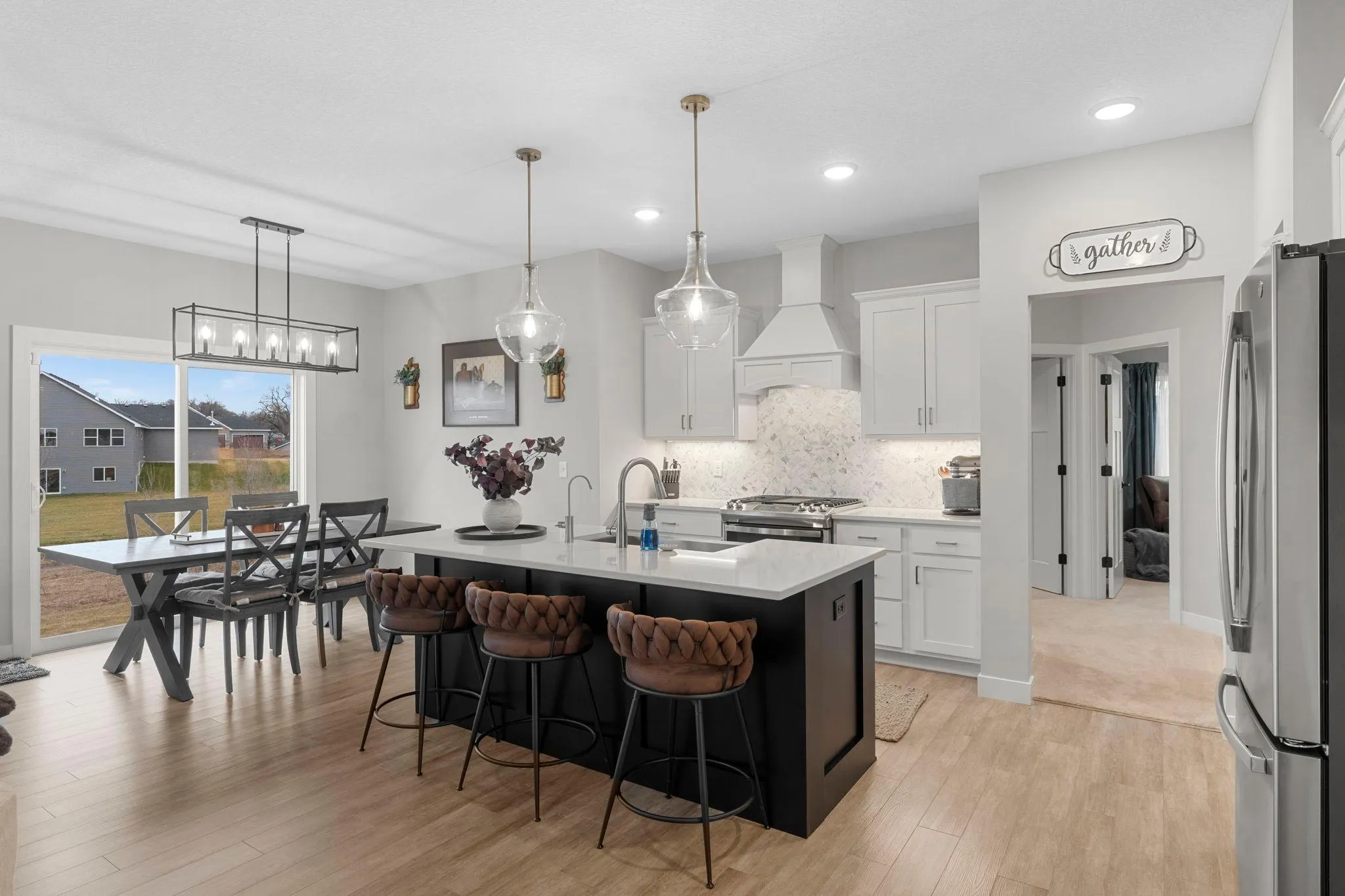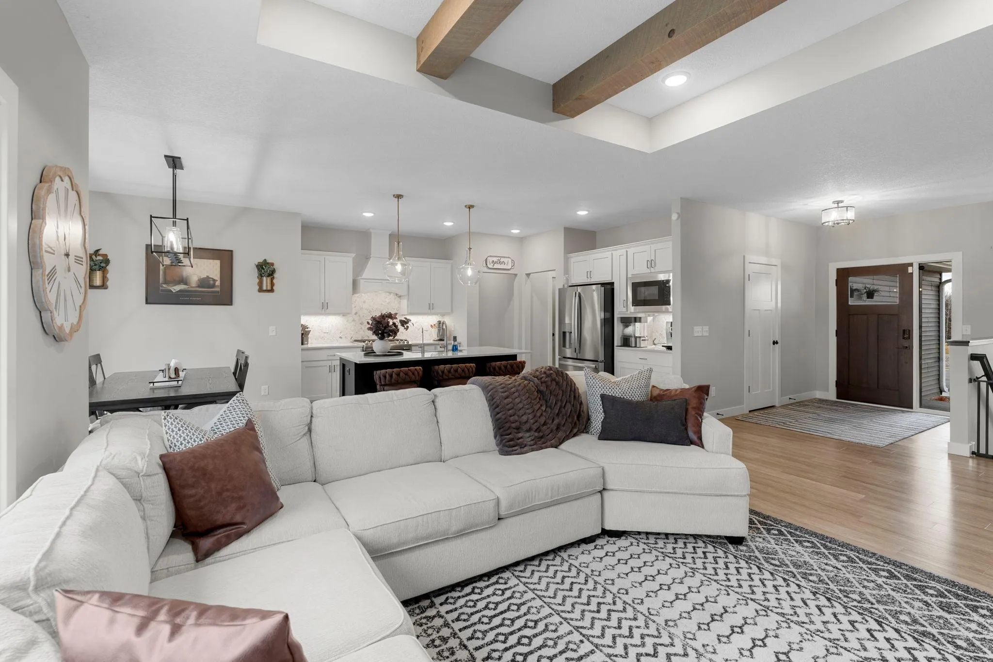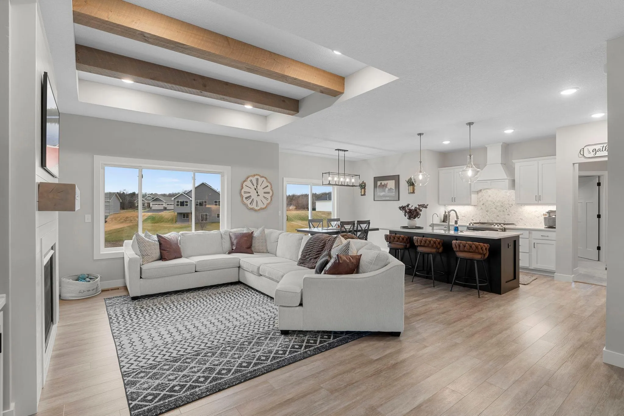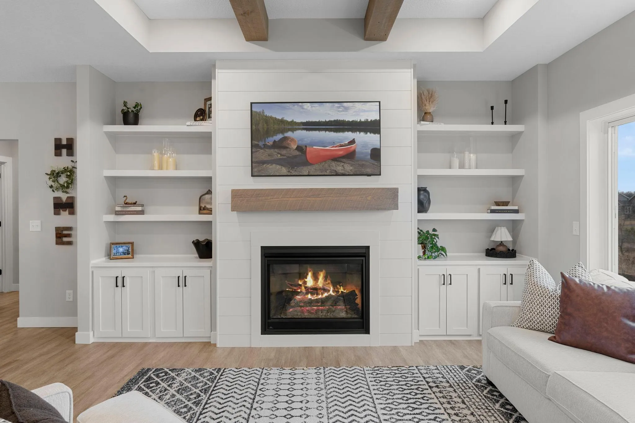 Open-concept living areas showcase hardwood floors, a tray-vault ceiling with wood beams over the living room, and a gas fireplace flanked by custom built-ins. The chef’s kitchen includes stainless appliances, custom cabinets and hood, a statement tiled backsplash, gorgeous countertops, a furniture-quality island with breakfast bar, farmhouse sink, and elegant lighting. A mudroom with a charming bench, a well-appointed main-floor laundry, and a fully insulated 4-car garage (1053 finished; extra-deep final stall for a boat) add practicality.