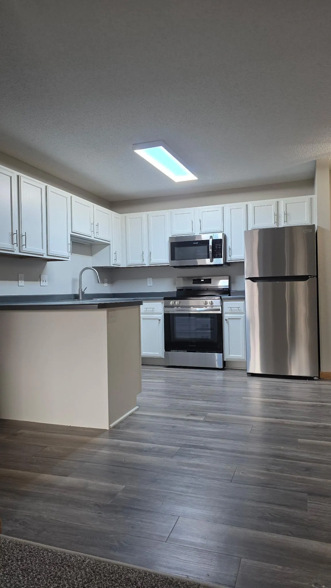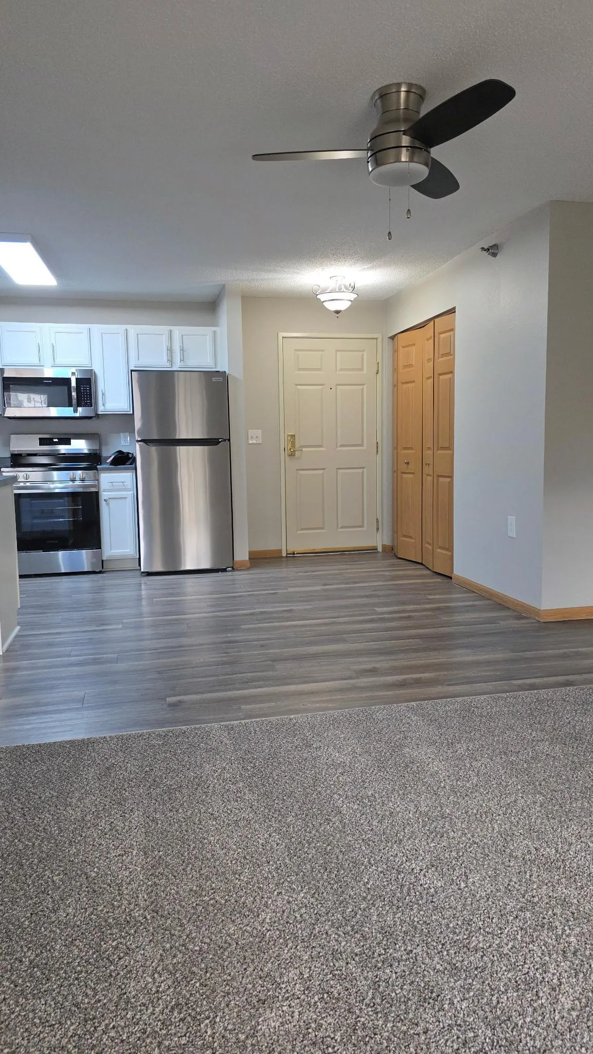 This spacious 2-bedroom, 2-bath condo features a functional floor plan with tasteful updates throughout. The interior offers fresh gray paint with crisp white ceilings, gray flooring in the entry, kitchen, and hallway, ceramic tile in both bathrooms, and newly installed carpet in the living room and both bedrooms. The kitchen is finished with white cabinetry and stainless steel appliances, creating a clean, modern look.