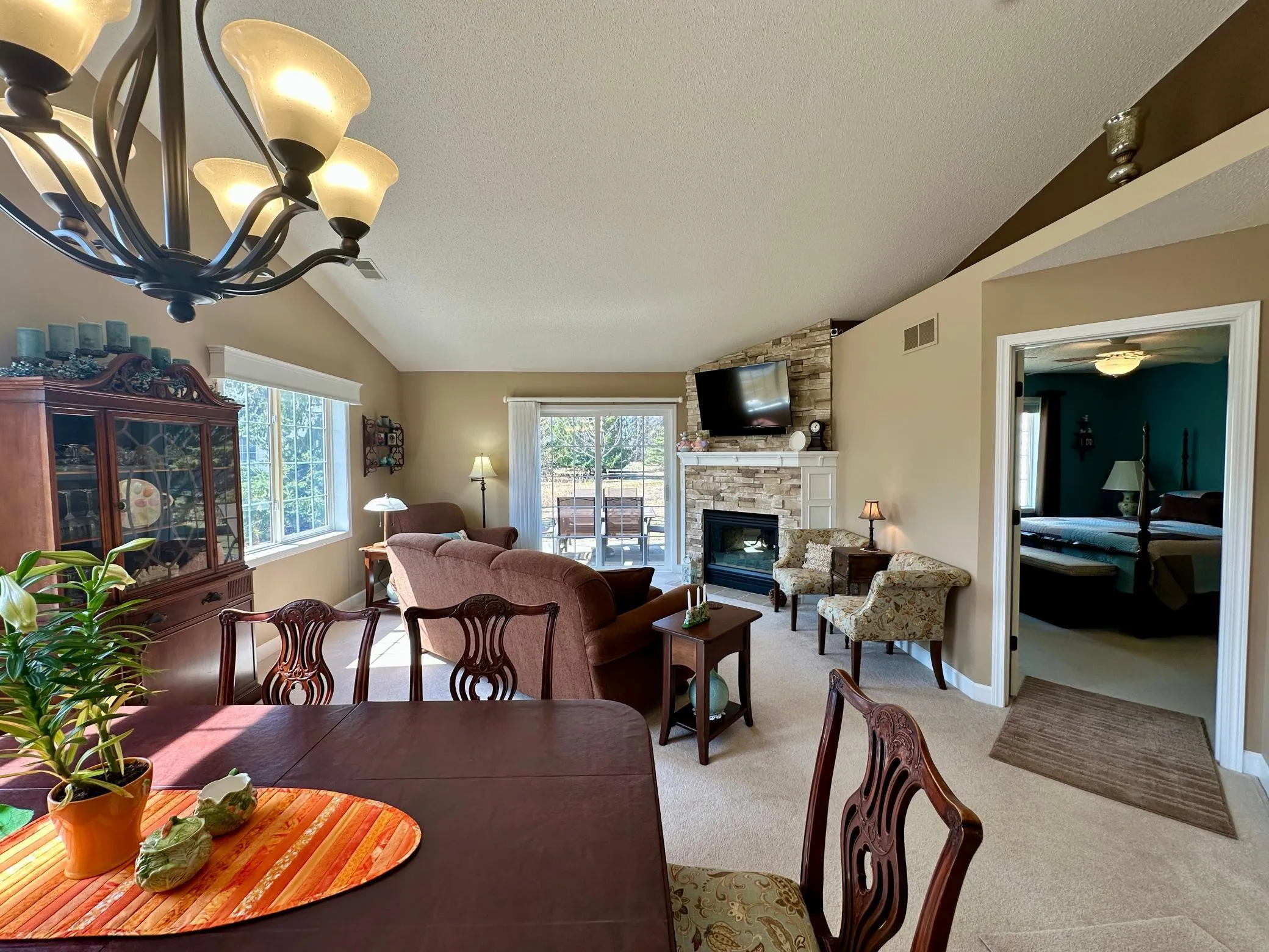 This end-unit townhome offers comfort and convenience with everything on the main floor. The bright, open floor plan features vaulted ceilings, oversized windows, and neutral tones. The kitchen has ample cabinetry and a charming eat-in area. The formal dining room and living room flow directly from the kitchen, providing ease of access. A corner gas fireplace serves as a focal point. Sliding glass doors lead to a spacious patio that overlooks a natural area with Dogwoods. The primary suite includes a walk-in closet and a luxurious ensuite with an expansive vanity and walk-in shower. The laundry doubles as a mudroom and has a utility sink. Located minutes from shops, restaurants, schools, parks, and more, this home combines functionality with charm. Don’t miss out on low-maintenance living in a prime location!