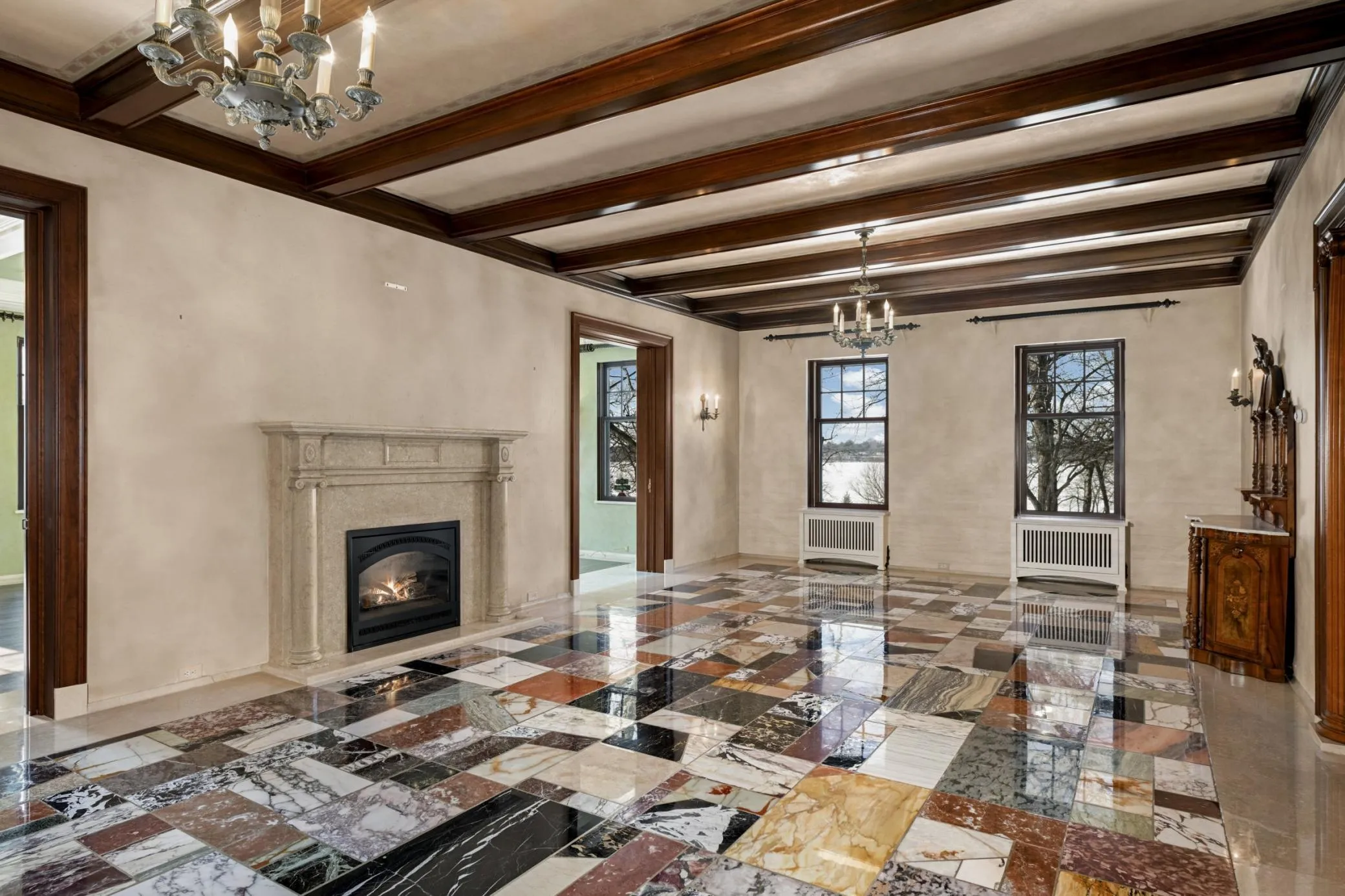 Inside, four finished levels showcase exceptional craftsmanship and scale. Marble, onyx, terrazzo, hardwood, and custom tile floors anchor a grand reception hall and sweeping staircase. Formal living and dining rooms, sun-filled gathering spaces, and a thoughtfully designed kitchen balance elegance with daily comfort.