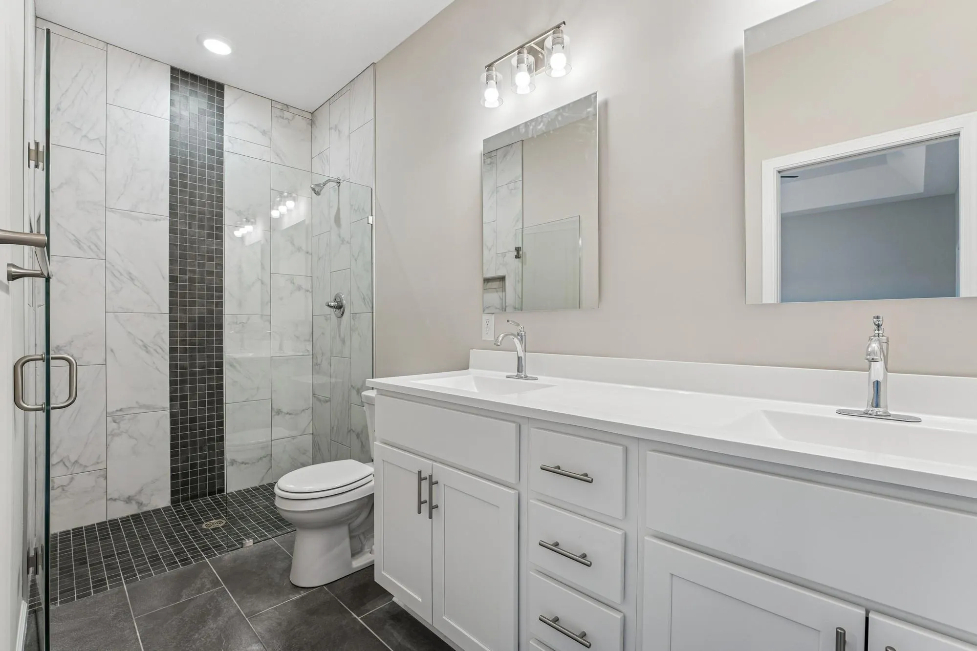 The owner’s suite includes a walk-in shower and double vanity, while the private laundry room offers added convenience with a sink, granite countertop and cabinetry.