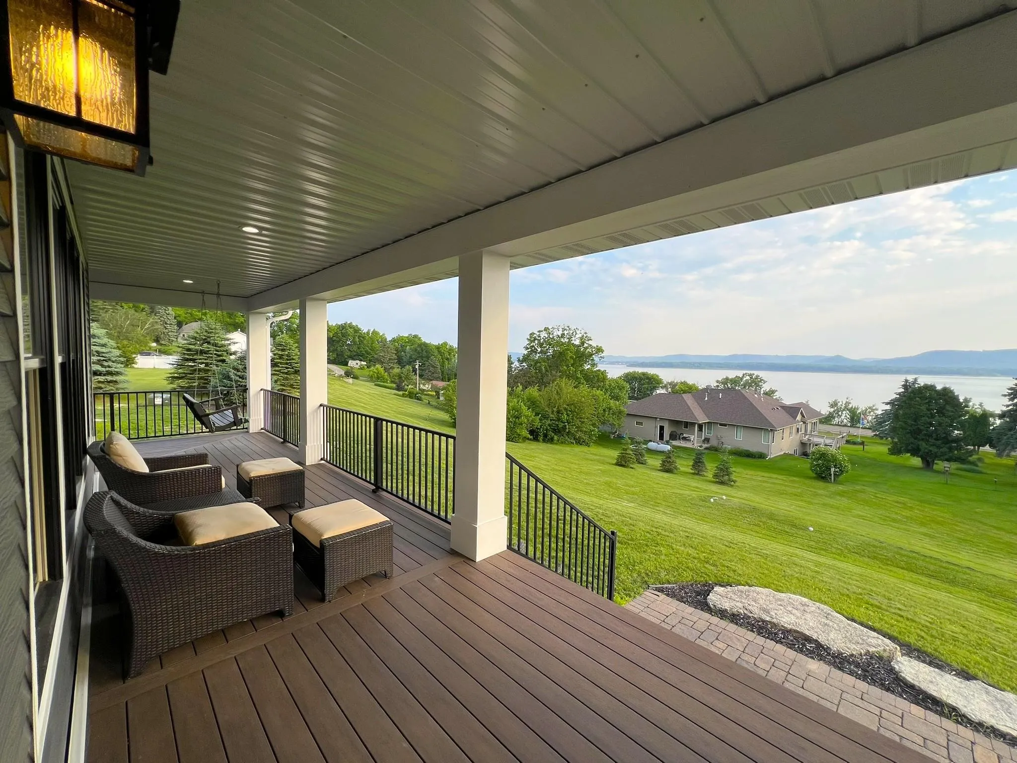 Exceptional property on 2.8 acres with panoramic Lake Pepin views, just outside the charming town of Stockholm! A rare opportunity to own and enjoy a truly beautiful homestead with awe-inspiring views from main and upper decks and numerous interior rooms. Step inside this luxurious home and you will immediately feel the warmth of the inviting interior and appreciate the location sitting on a hill overlooking the great Mississippi River. Enjoy not only the river side views but also the serene bluff side views from the covered porches and second floor deck. Many updates including new siding, mud room addition, large insulated/paneled 3 car garage with steel roof and heater/electric car hookups, custom blinds, new landscaping, new front and side doors, stacked laundry, new furnace and A/C and more. The main level boasts a great room with sliding barn doors and fireplace, kitchen, dining, ensuite bedroom with 3/4 bath and sliding doors to paver patio, 2nd bedroom with private sink area and walk-in closet, laundry room and a new mud room and side entry to garage. Upper level has numerous opportunities and was recently used as a primary bedroom suite with great room, full bath with separate shower and soaking tub, walk-in closets and another bedroom which could also be used as an office. This level is plumbed for a kitchen and washer/dryer. The walkout lower level is studded and ready to be finished and has a finished 3/4 bath with in-floor heat. This level also is plumbed for a washer/dryer. Other features include walnut and tile flooring plus granite countertops throughout, a Kinetico water filter/reverse osmosis, inground sprinkler system plumbed in (not currently used), and ceiling fans and heater for bluff side porch. This dream home awaits your arrival! ADDITIONAL 1.55 ACRE LOT AND A WOODED 7.1 ACRE LOT for sale adjacent to this property!!