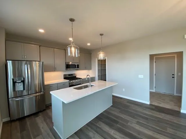 Welcome to the FINLAND floorplan! This spacious 4-bedroom (w/ main floor bedroom OR office) is situated in Dayton MN’s Premier neighborhood, Riverwalk. It has close proximity to a neighborhood park, pickleball courts, trails, and just steps from new neighborhood pool and Clubhouse now open! Also, Main floor features include an open-concept design plan with a kitchen, family room, dining area, and a main floor bedroom with a nearby full bath. Upper level features include three additional bedrooms, a loft, and laundry room. The unfinished basement includes walkout patio door that leads huge backyard, includes 3/4 bath rough-in. Landscaping, sod and irrigations system included and now completed ! ***Prices, square footage, and availability are subject to change without notice. Photos and/or illustrations may not depict actual home plan configuration. Features, materials and finishes shown may contain options that are not included in price.***