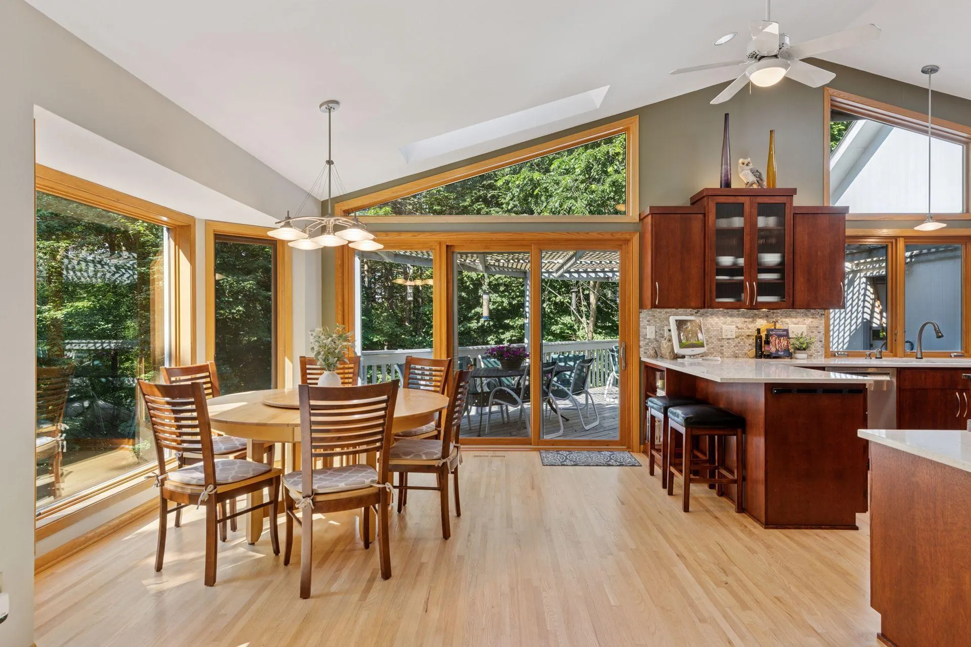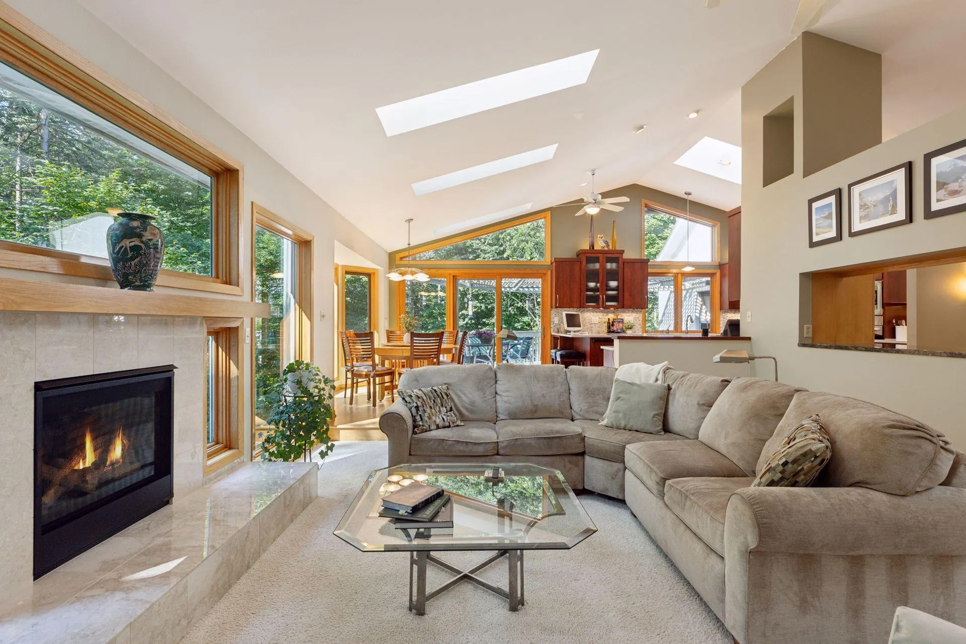 Thoughtfully designed with high-end finishes, the home features an open-concept main level flooded with natural light from skylights and expansive windows. Vaulted ceilings in the great room elevate the space, creating an airy, welcoming atmosphere. The updated kitchen is a showstopper, boasting warm-stained custom cabinetry, granite countertops, stainless steel appliances, refinished wood floors (2024), a built-in hutch, pull-out trash, and two corner cabinet pullouts for maximum efficiency.