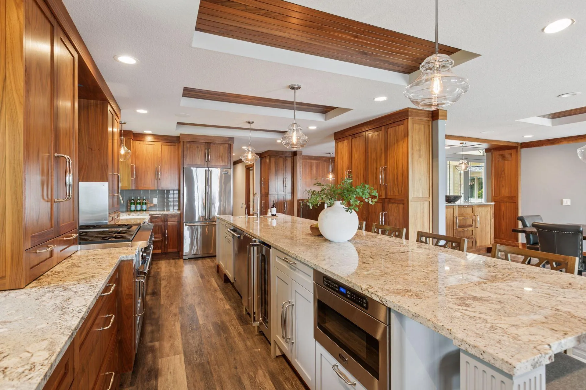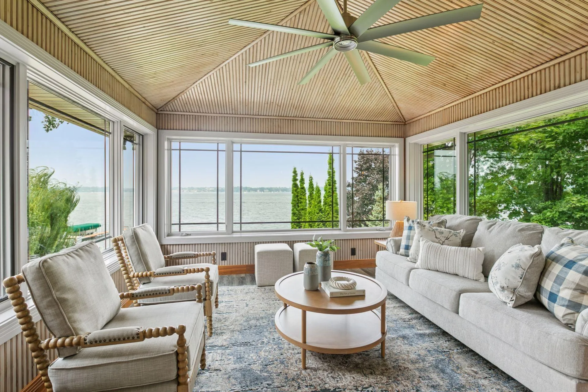 At the heart of the home, the chef’s kitchen becomes the natural gathering place with its impressive 14-foot island, Viking appliances, and exceptional storage—ideal for hosting weekend brunches, intimate dinner parties, or casual lake-day lunches. Nearby, the great room offers a welcoming space to unwind by the stone fireplace while watching boats glide across Wayzata Bay.