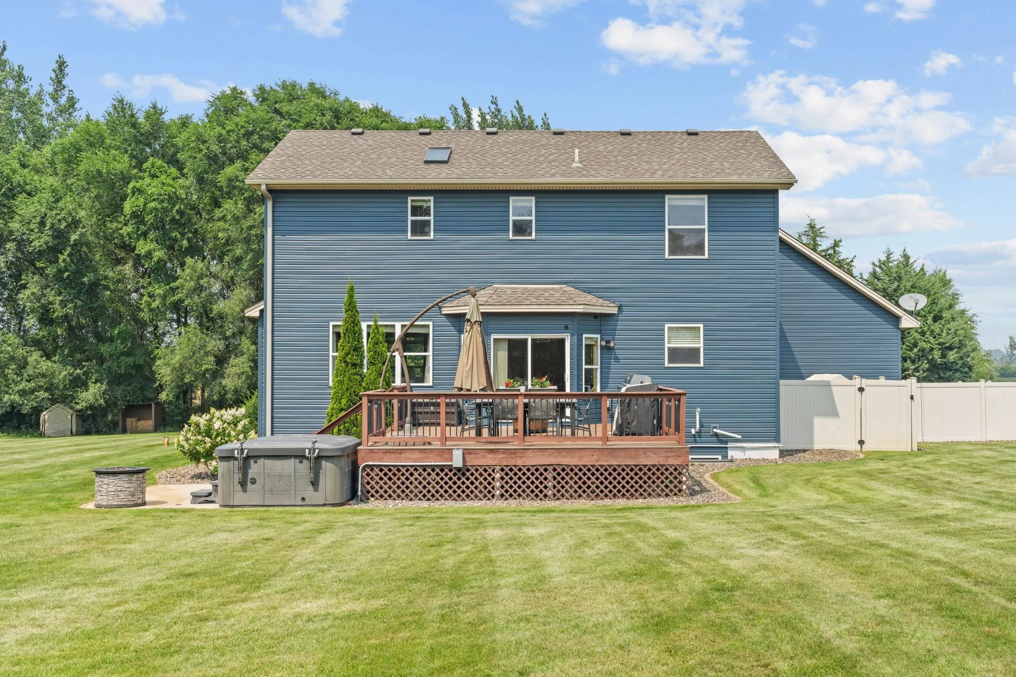 Welcome Home to fresh new paint and carpet (installed the week 10/27) in this spacious and family-friendly retreat nestled on a generous 1.34-acre corner lot in a prime Ham Lake location! Built in 2005, this well-maintained 5-bedroom, 4-bathroom home offers an ideal blend of space, comfort, and a huge private yard for all your entertainment needs.This home features 9’ ceilings throughout the main level. The decks (Trex) and siding have all been redone in the past two years to provide your next home is turnkey and maintenance free! The large garage and land provide plenty of storage opportunities for all your toys. Mom will love the 4 bedrooms all together on the 2nd level w. A spacious and private owner’s suite. The lower level offers a private retreat with a spacious guest bedroom (could also be an office) and a beautiful ¾ bath in addition to the family room. The in ground sprinkler system can be controlled right from your phone, full security system, and hot tub could stay. You will not want to miss this beautiful home now that the owners have contracted fresh, neutral paint and carpet inside!