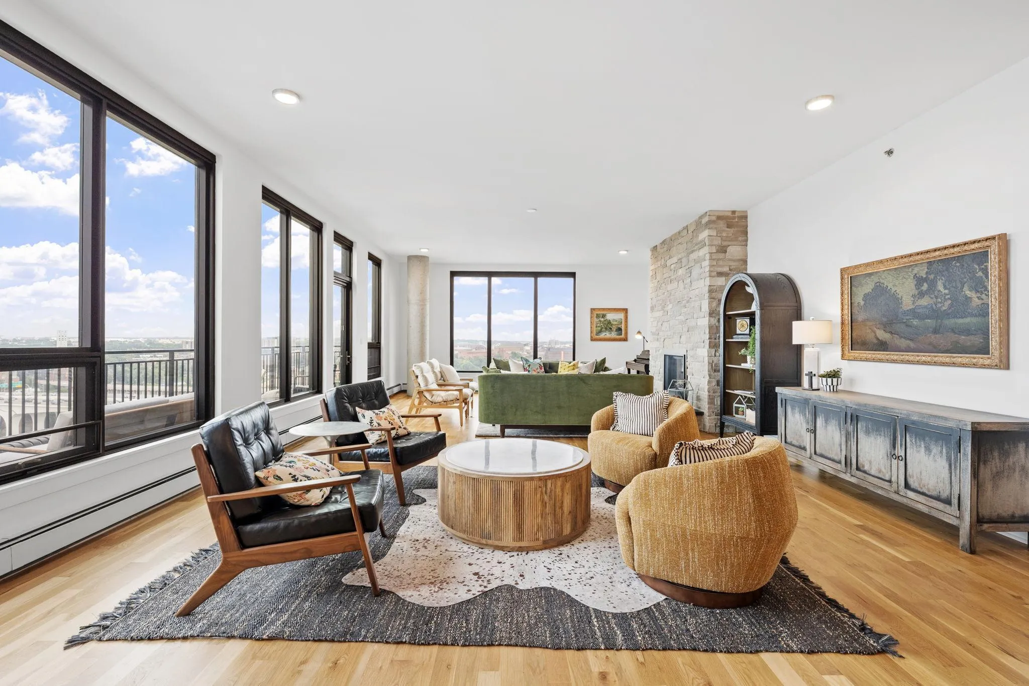 From the moment you step inside, sweeping panoramic vistas of the Mississippi River greet you through floor-to-ceiling windows on two sides. Natural light floods in, creating a serene connection to the world below, as if perched in a tranquil retreat above the city.