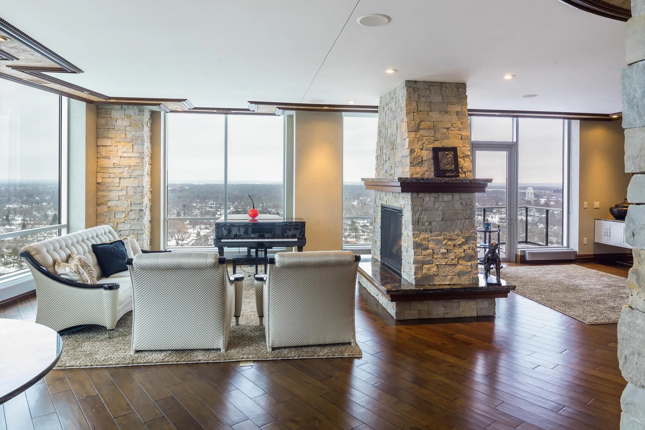 perched atop the exclusive Galleria residences, this light-filled penthouse offers refined living with walls of glass, a private balcony, and a fireplace that adds drama and warmth to the space. The open layout accommodates a customizable one- or two-bedroom configuration, with neutral finishes ready for your personal touch.