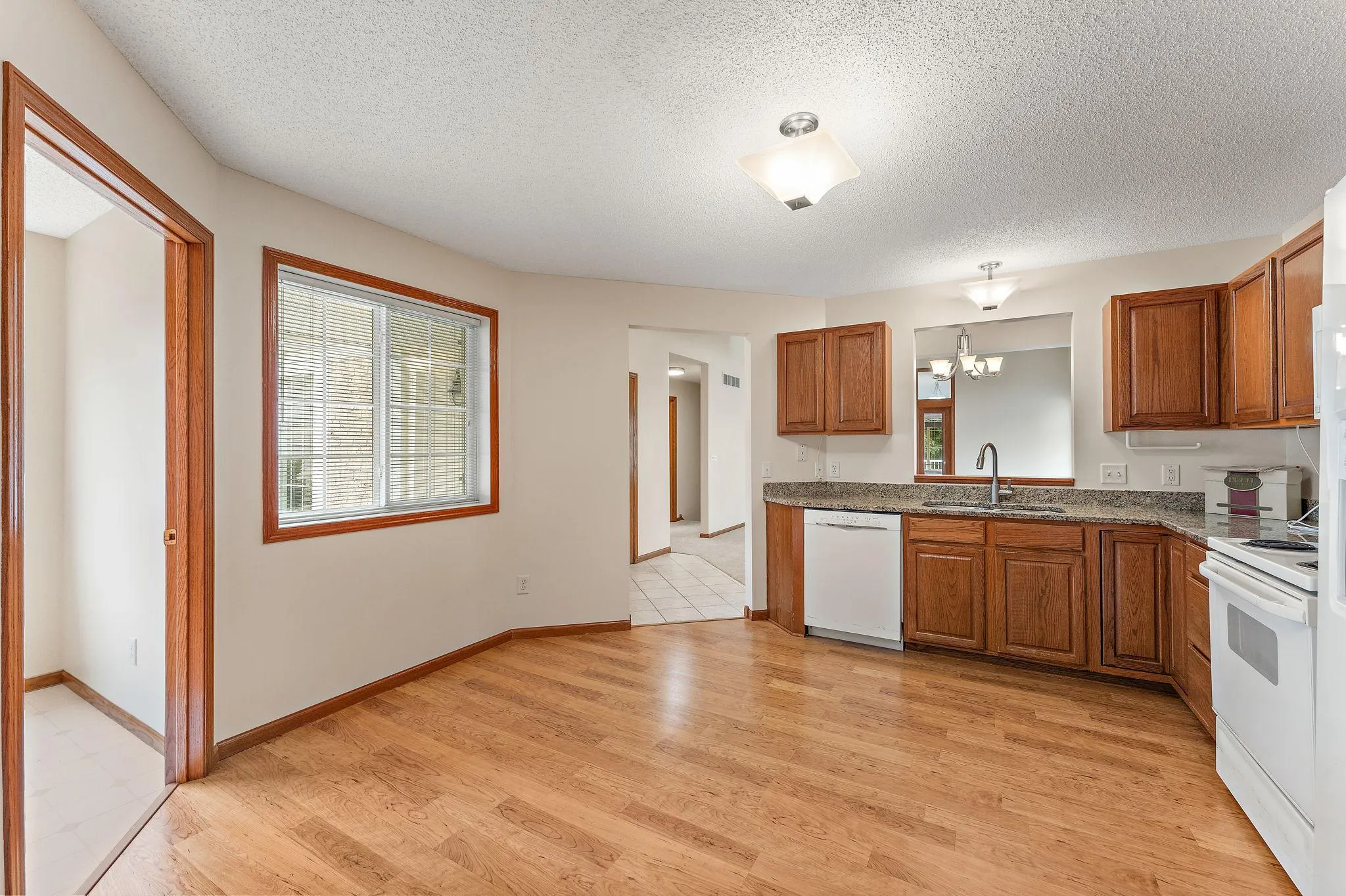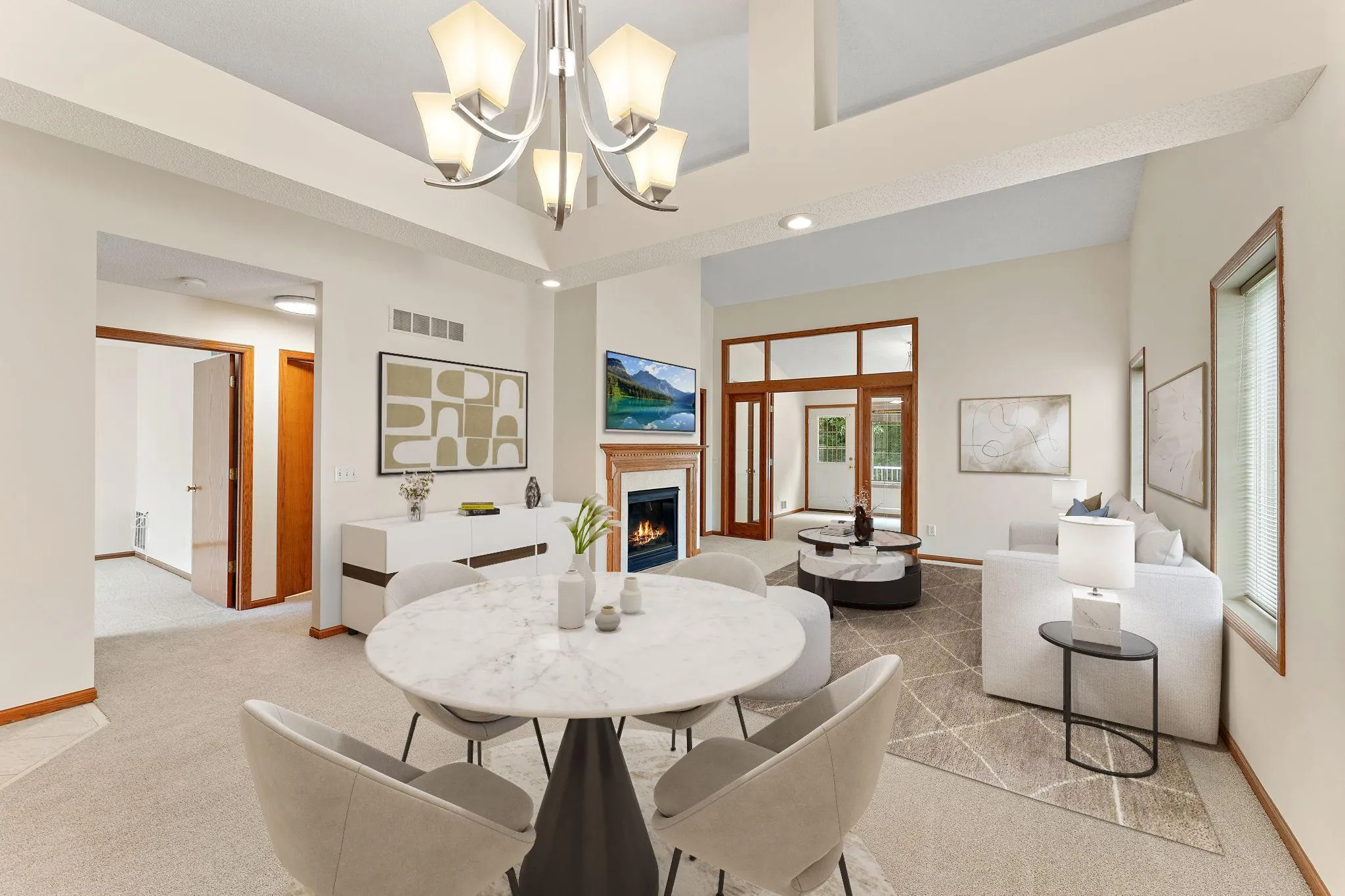 Wonderful Main Level Living. Welcome to this updated 3 bedroom 3 bath townhome located in a quiet neighborhood. Open and airy main floor features a beautiful four season sunroom, vaulted living room with gas fireplace, large adjoining dining room, 2 main floor bedrooms including the primary suite with walk-in closet and large full bath. The large open kitchen offers abundant cabinet and counter space and direct access to the garage. The main floor laundry room is bright and sunny. All new main level carpet, paint and lighting.