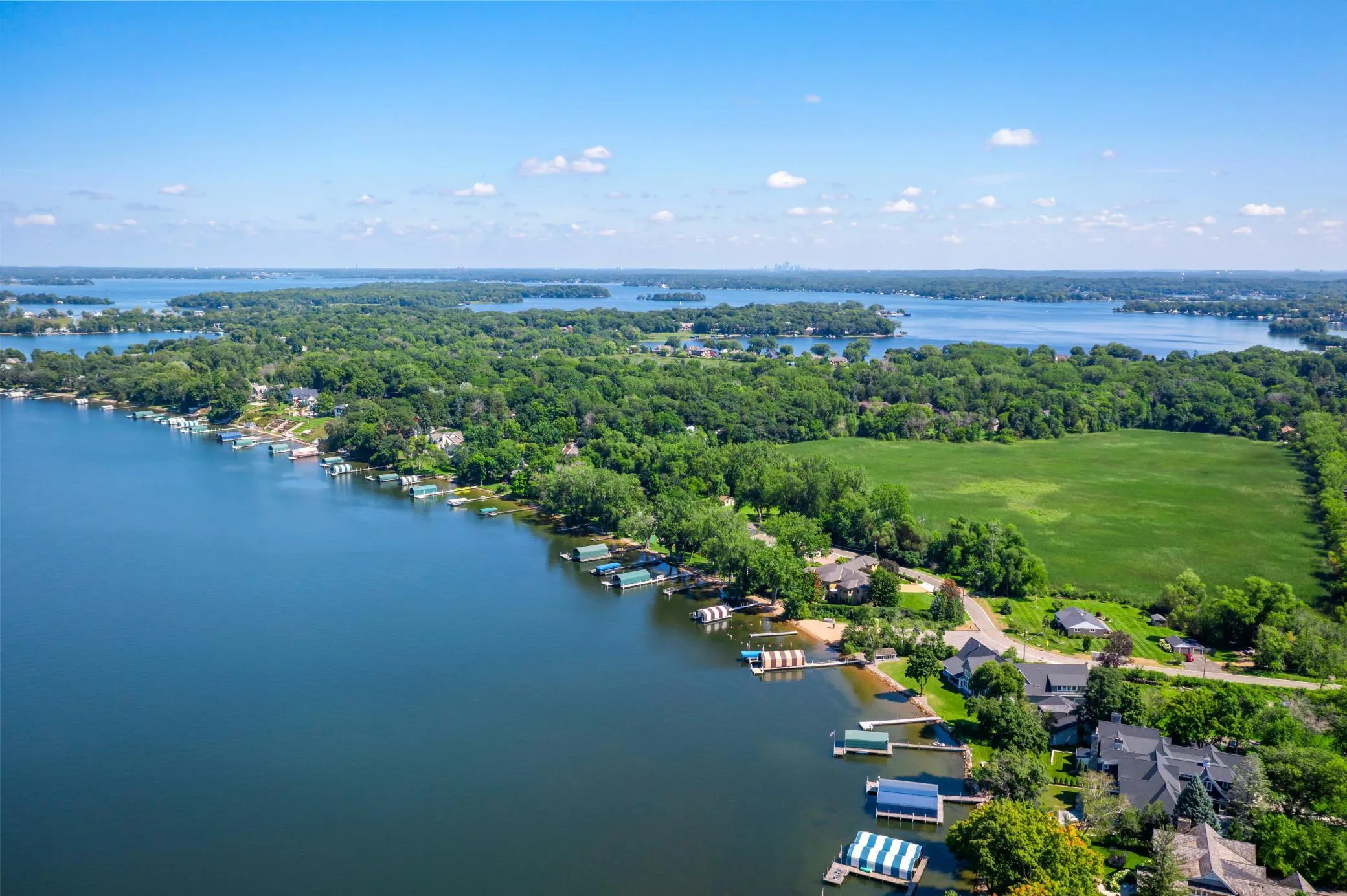 Rare opportunity to own this well-appointed home with panoramic views of Carman Bay. Sandy beach, gorgeous sunsets, level lot and close proximity to downtown Excelsior. 230 Birch Bluff Road is a grand Tuscan two story and boasts 8263 square feet including a 3-car garage with a separate shop and storage. Main floor kitchen has a large center island, generous workspace, and hearth room. 5 bedrooms and 8 baths. 2 Owner suites with 3 additional en-suite bedrooms along with main and upper-level laundry. The game room includes the 2nd kitchen, custom banquette, bar, and theater room. Also included is a Wine cellar, 4 gas fireplaces, top of the line appliances, built-ins, and coffered ceilings. Dock includes 2 boat lifts. Other exterior features include expansive stone patio surrounded by half wall with pergola, the 4th fireplace, 2 balconies and firepit overlooking the sandy beach. Newer upper-level owners suite was specifically designed with lake views and privacy in mind! A wall of windows, lounging area, private balcony, 2 walk-in closets, yoga/workout room. Please see supplement for more details about this exceptional property.