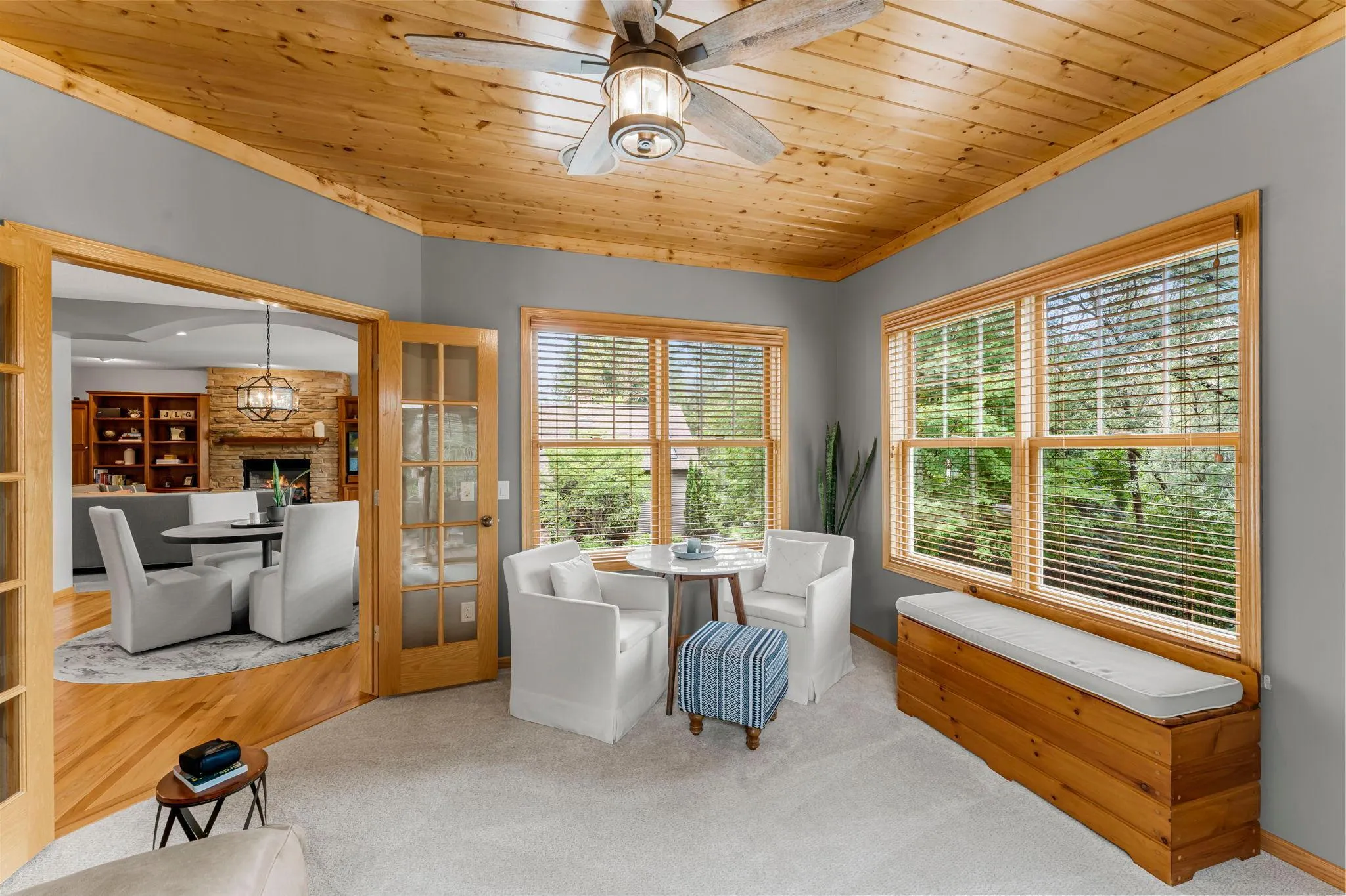 Beautifully updated five-bedroom, four-bathroom home in peaceful Oxbow Creek East, ideally located on a quiet cul-de-sac backing to the scenic Rush Creek Regional Trail. Enjoy frequent wildlife sightings, over ten miles of connected trails, and convenient access to parks, shopping, and dining. Home features seven legal bedrooms, offering flexible options for offices, guest rooms, or a gym. The dream kitchen includes cherry cabinetry, stainless steel appliances, gas cooktop, walk-in pantry, and refinished hardwood floors. Sunroom opens to a large maintenance-free deck with pergola. The main-level living room features a gas fireplace, built-ins, and in-ceiling speakers that extend throughout the home. Also on the main level: two versatile rooms, full bathroom, laundry, mudroom, and access to a three-car garage with electric vehicle-ready sub-panel. Upstairs offers three bedrooms with new carpet (2024), including a spacious primary suite. Finished walkout lower level includes family room, custom wet bar with kegerator, two additional bedrooms, and fenced backyard with patio and firepit. Numerous updates throughout—truly move-in ready!