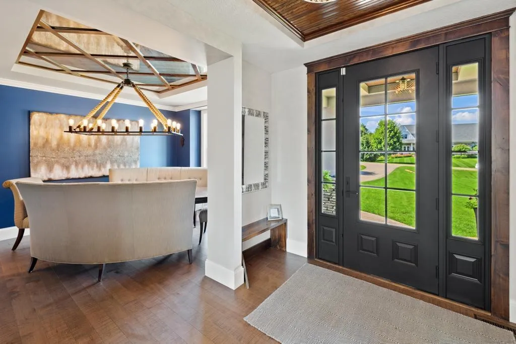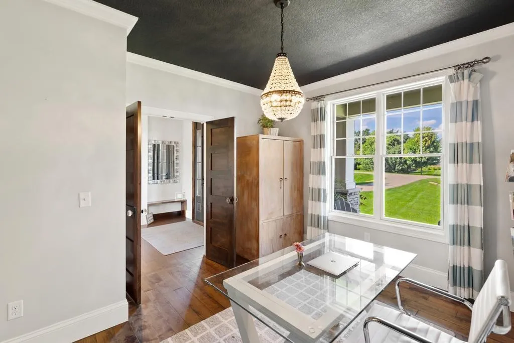 morning coffee or getting lost in a good book. The gourmet kitchen is a chef’s dream, anchored by a large wrap-around island with a built-in banquette for casual dining. It’s equipped with high-end Thermador appliances, including a 6-burner gas stove with griddle, French door refrigerator, and dishwasher with custom cabinetry fronts. The walk-in pantry adds ample storage, while granite countertops and a custom backsplash add refined details throughout. Adjacent to the kitchen, the main floor bar showcases concrete countertops paired with reclaimed barnwood cabinetry, offering an approachable yet elevated space for mixing cocktails or enjoying a nightcap. This area flows seamlessly into the sunroom, which features heated floors, a second gas fireplace with a reclaimed wood mantle, and panoramic views that invite natural light year-round. The primary suite offers a peaceful retreat with a tongue-and-groove ceiling and expansive windows overlooking the backyard. The spa-inspired primary bath includes dual vanities, a free-standing soaking tub under a bright window, a walk-in shower, heated floors, and a built-in sauna — all designed for ultimate relaxation. A large walk-in closet with custom organization completes the suite. Downstairs, the lower level provides a flexible living space with heated luxury vinyl plank flooring and a brick accent wall. This area accommodates a private guest bedroom and bath, a dedicated workout room, a locked workshop, and plenty of space for movie nights or casual gatherings. Step outside to discover your own private resort-style backyard featuring a covered patio with grilling and prep area, a concrete patio, and a sparkling pool with diving board and slide. The adjacent cabana offers a stylish space to relax or entertain, while the premier pickleball court invites friendly competition. A fire pit with built-in seating rounds out this exceptional outdoor retreat. Additional highlights include a heated, epoxy-floored garage with shelving and a utility sink, a main floor office with custom wallpaper and double glass doors, central vacuum with strategically placed dust pans, and a new front door with a three-point locking system. Situated just minutes from downtown Afton’s charming shops and restaurants, the St. Croix River State Park, and Woodbury’s premier shopping and dining, this home combines refined living with unparalleled convenience!