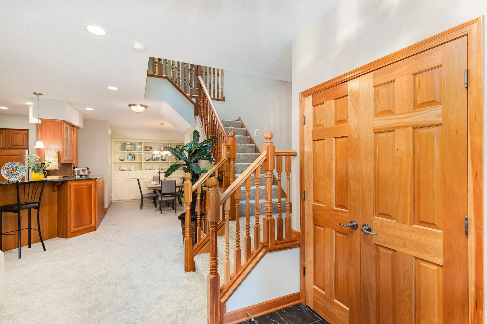 entertaining. The kitchen features a convenient breakfast bar, walk-in pantry and plenty of room for gatherings. Plus, this kitchen boasts a warming drawer and an osmosis water filter. Adjacent to the kitchen, a formal dining room with a built-in china cabinet and linen cabinet adds charm and functionality for special meals. Upstairs, a spacious loft (including a small refrigerator) provides flexible living space, ideal for a home office, reading nook, or play area. The primary suite provides a welcome retreat, highlighted by elegant French doors, a jetted tub, separate shower and a generous walk-in closet. The upper level also features a laundry room, guest bathroom, and a large second bedroom complete with built-in cabinetry and