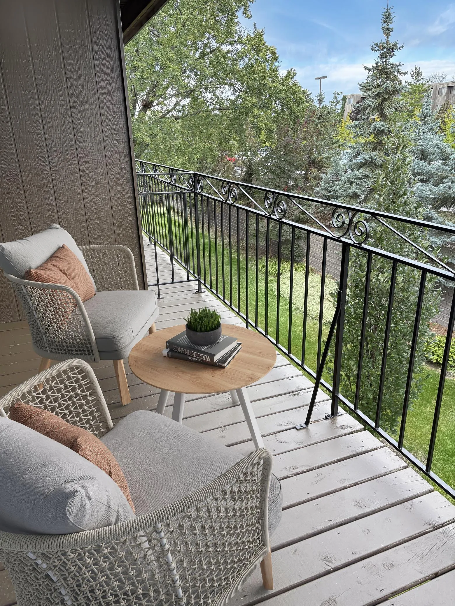 North-facing unit overlooking evergreens, updated summer 2025–freshly painted balcony, freshly painted unit, new carpeting, updated hardware; common laundry and storage near the unit.