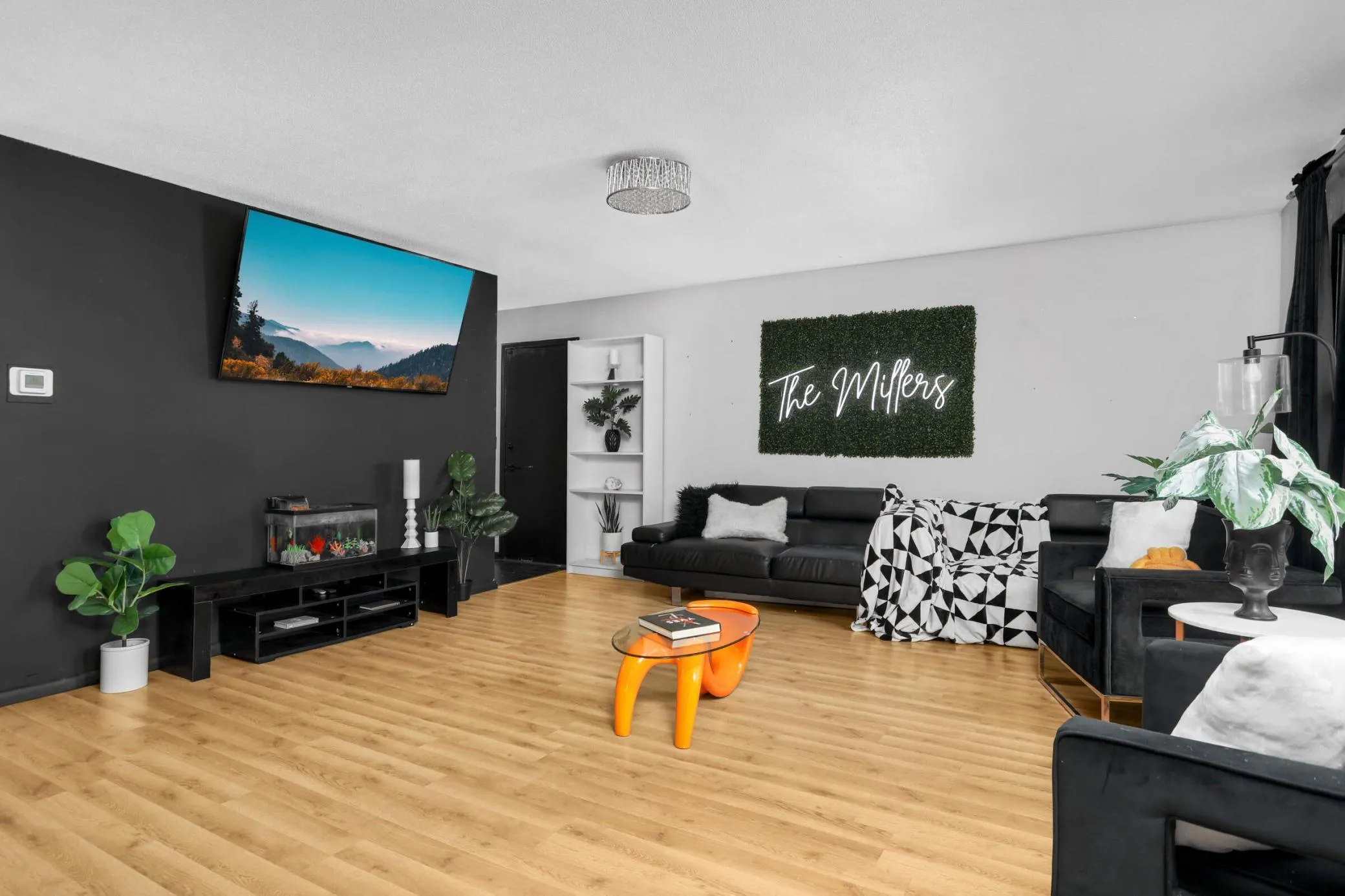 Bright and open floor plan featuring modern finishes, stylish black-and-white accents, and durable flooring throughout. The updated kitchen shines with bold cabinetry, stainless steel appliances, hexagon backsplash, and marble-style counters, flowing seamlessly into the dining area with statement lighting.