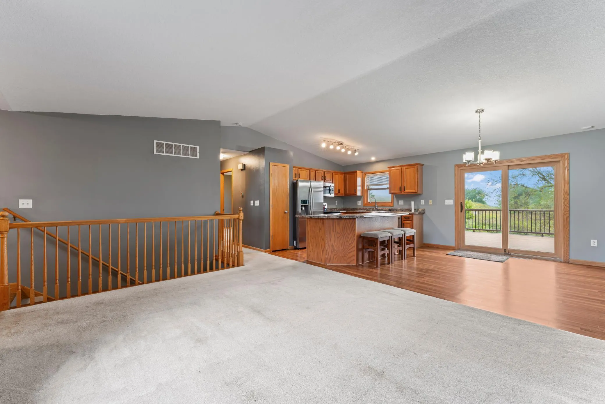 Situated in the desirable Diamond Ridge/Country Club Manor neighborhood, this beautifully maintained 4-bedroom, 2-bath, 2000+ sq ft walkout rambler offers incredible countryside views and a private backyard retreat. This move-in ready home is filled with thoughtful updates, including new water heater (2024-2025); new windows and gutters (2021); PolyTek garage floor, storage shed, Trex decking with lighting, fencing and concrete patio (2019), and furnace & A/C (2018). Inside, you’ll find an upgraded kitchen with stainless steel appliances, an expansive island, and beautiful flooring throughout. Vaulted ceilings add to the open feel, while the upgraded baths feature stylish tile and modern finishes. Step outside to relax on the deck and take in stunning sunsets or gather with friends and family for grilling and entertaining in the spacious backyard.