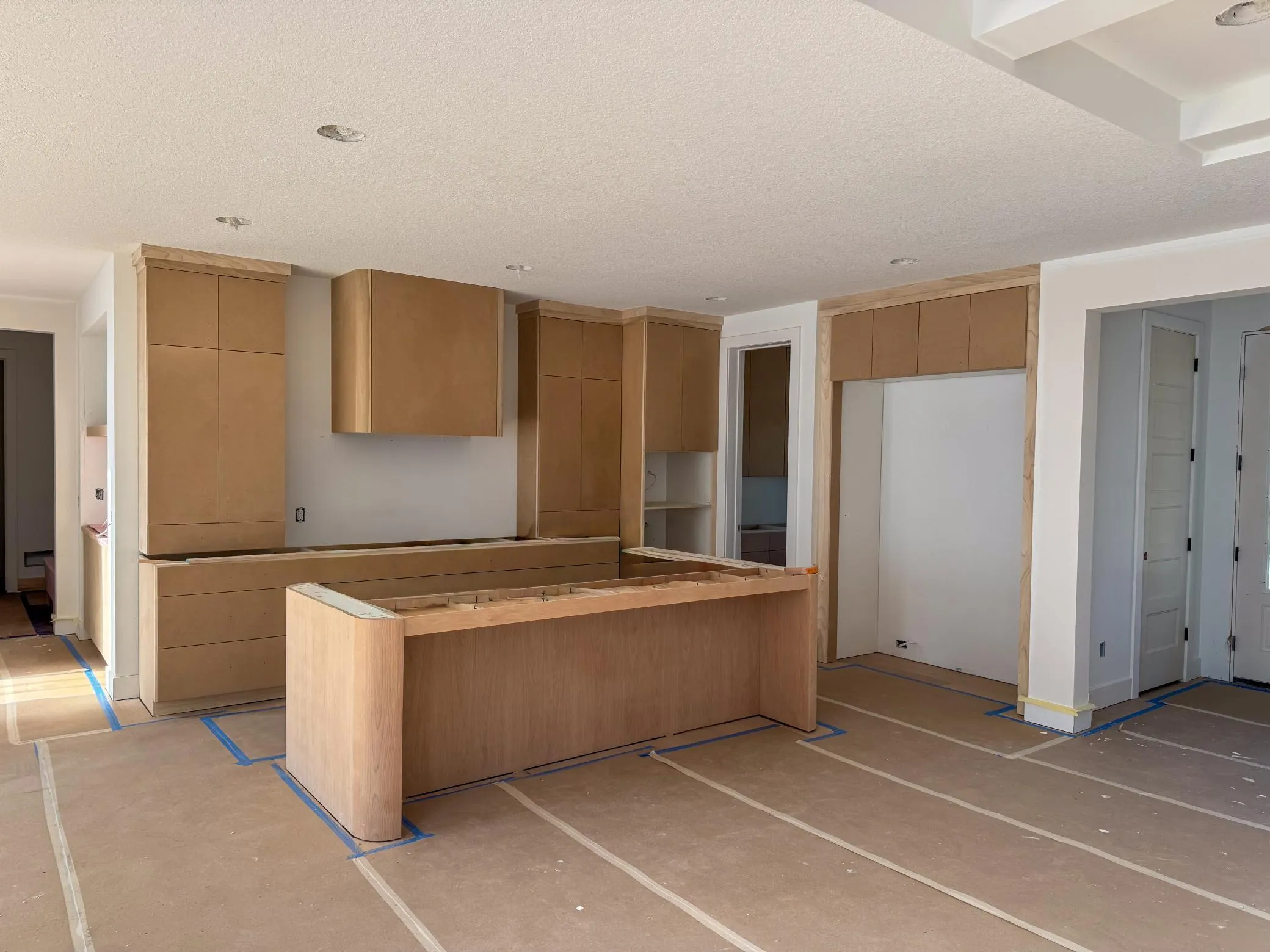 The main level welcomes you through a two-story foyer into an open-concept great room with box-beamed vaulted ceiling and gas fireplace. The gourmet kitchen features a large center island, paneled refrigerator and dishwasher, built-in oven, premium range, and a walk-in pantry. A main-floor bedroom with ¾ bath offers flexible guest or multi-use options, and a separate study with double doors provides a dedicated office or library. The mudroom includes a built-in bench and walk-in closet connecting to the three-car garage. Hardwood flooring extends through the main hallways and stairways for warmth and continuity.