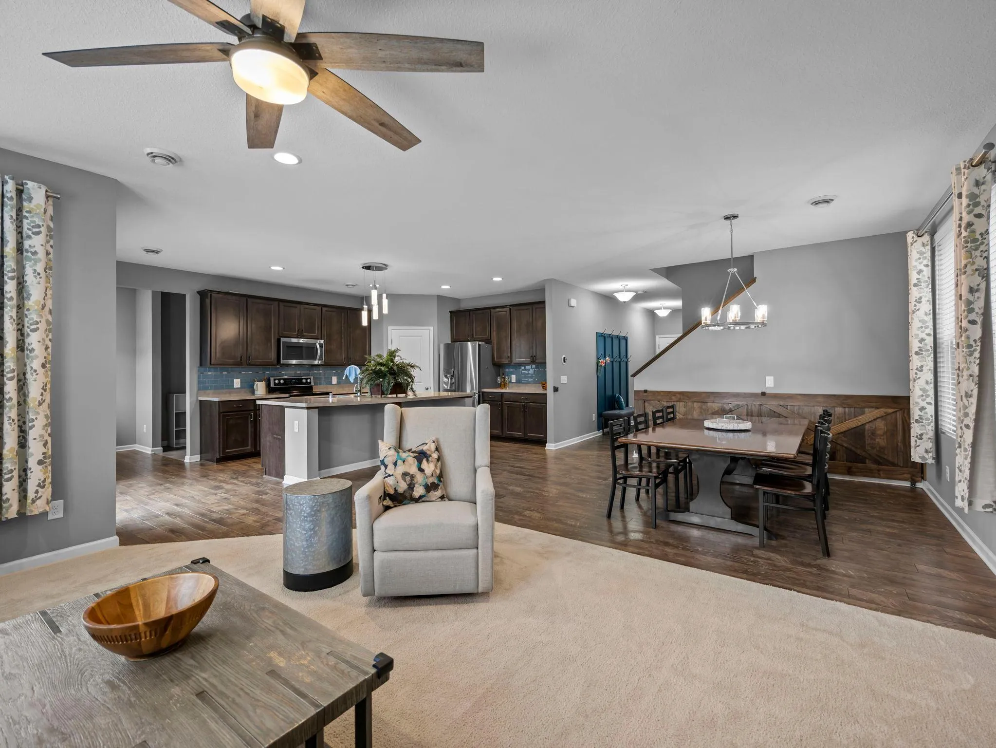 Welcome to this beautifully updated two-story home in Apple Valley! Offering a bright and functional layout, this residence features spacious living areas with large windows that fill the home with natural light. The open-concept main level includes a modern kitchen with rich cabinetry, stainless steel appliances, tile backsplash, and a center island that flows seamlessly into the dining and living spaces—perfect for both everyday living and entertaining.