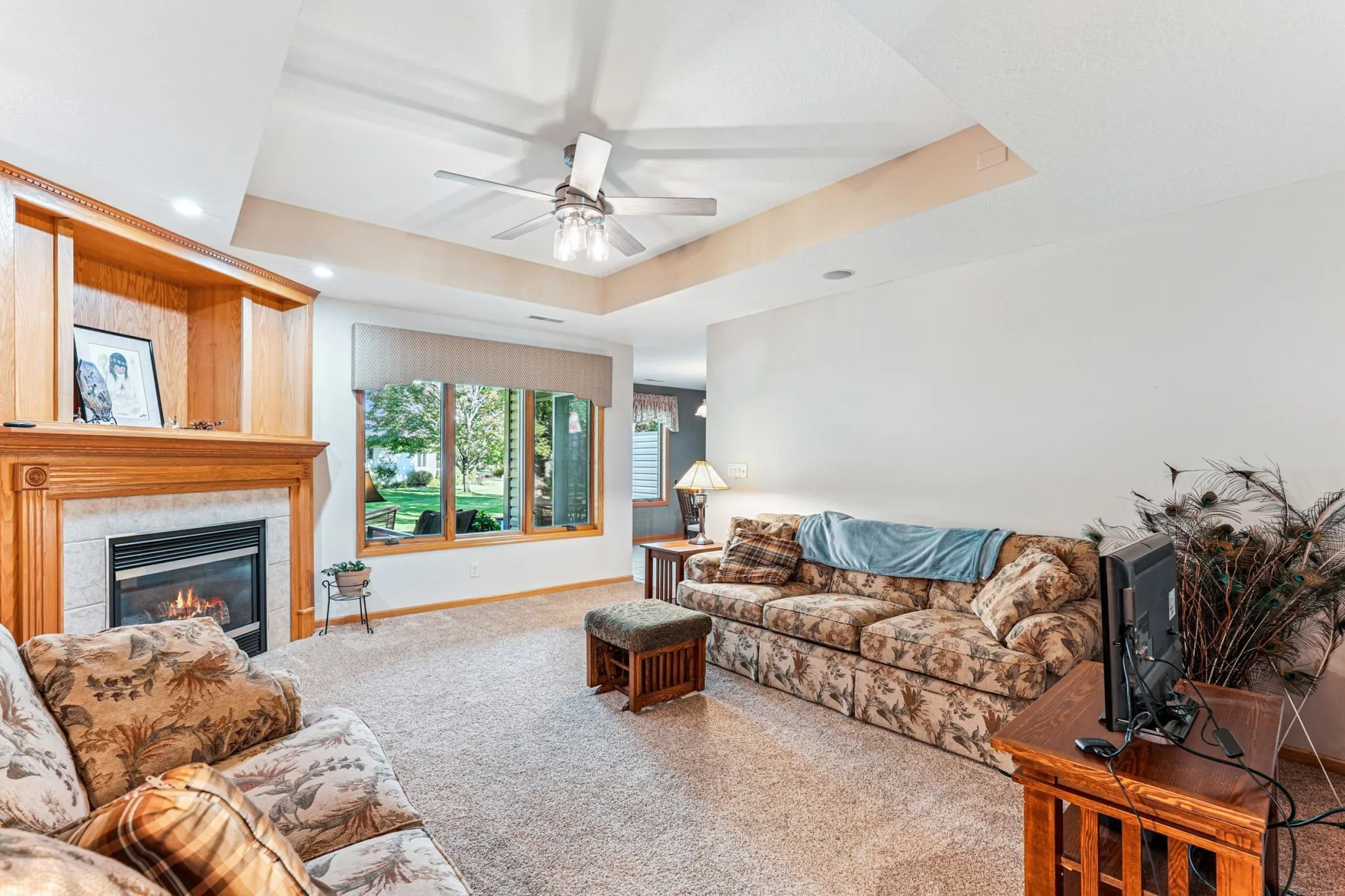 The spacious kitchen features raised panel oak cabinets and a bright solar tube that fills the space with natural light. Gather in the cozy living room by the gas fireplace, or step outside to your covered patio with epoxy finish and enjoy peaceful views of the private backyard.