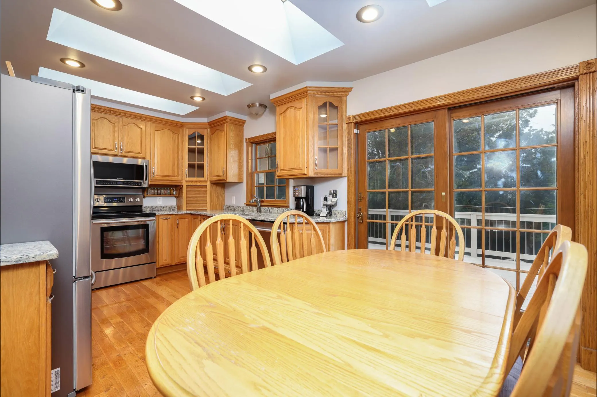 Both upper and lower level walkout patio doors. Upper level walkout to freshly stained deck the length of house. Lower level walkouts to patio with landscaped backyard, tiered retaining walls, perennials, and waterfall pond great for relaxing, entertaining abutting privately owned woodland.