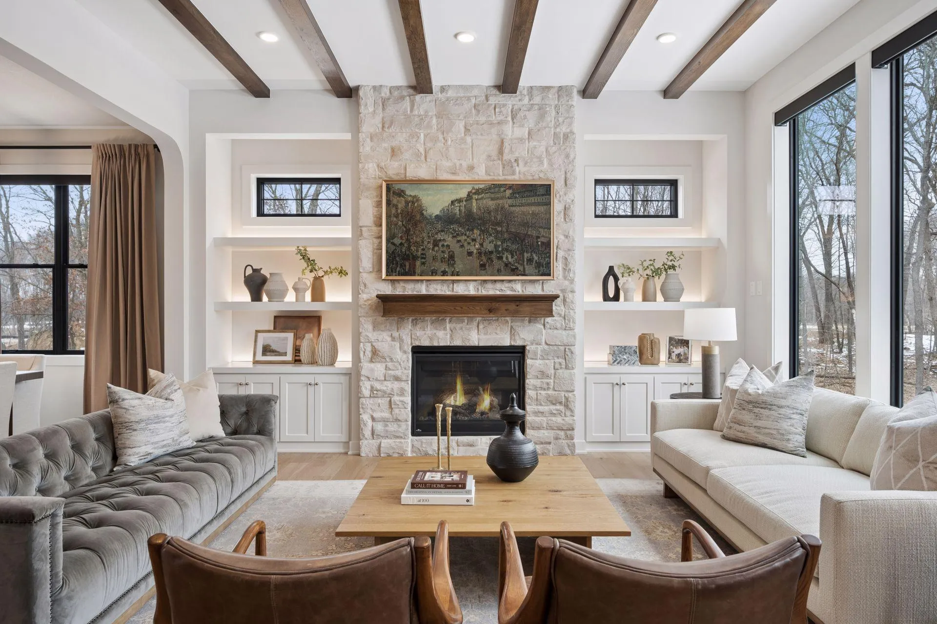 The main level features soaring 10’ ceilings with rustic wood beam accents in the Great Room, while a 9.5’ center island anchors the gourmet kitchen, surrounded by custom cabinetry and a dinette area with built-in bench seating. A cozy sunroom invites relaxation with a floor-to-ceiling stone fireplace and wood beams, creating a warm and inviting retreat.