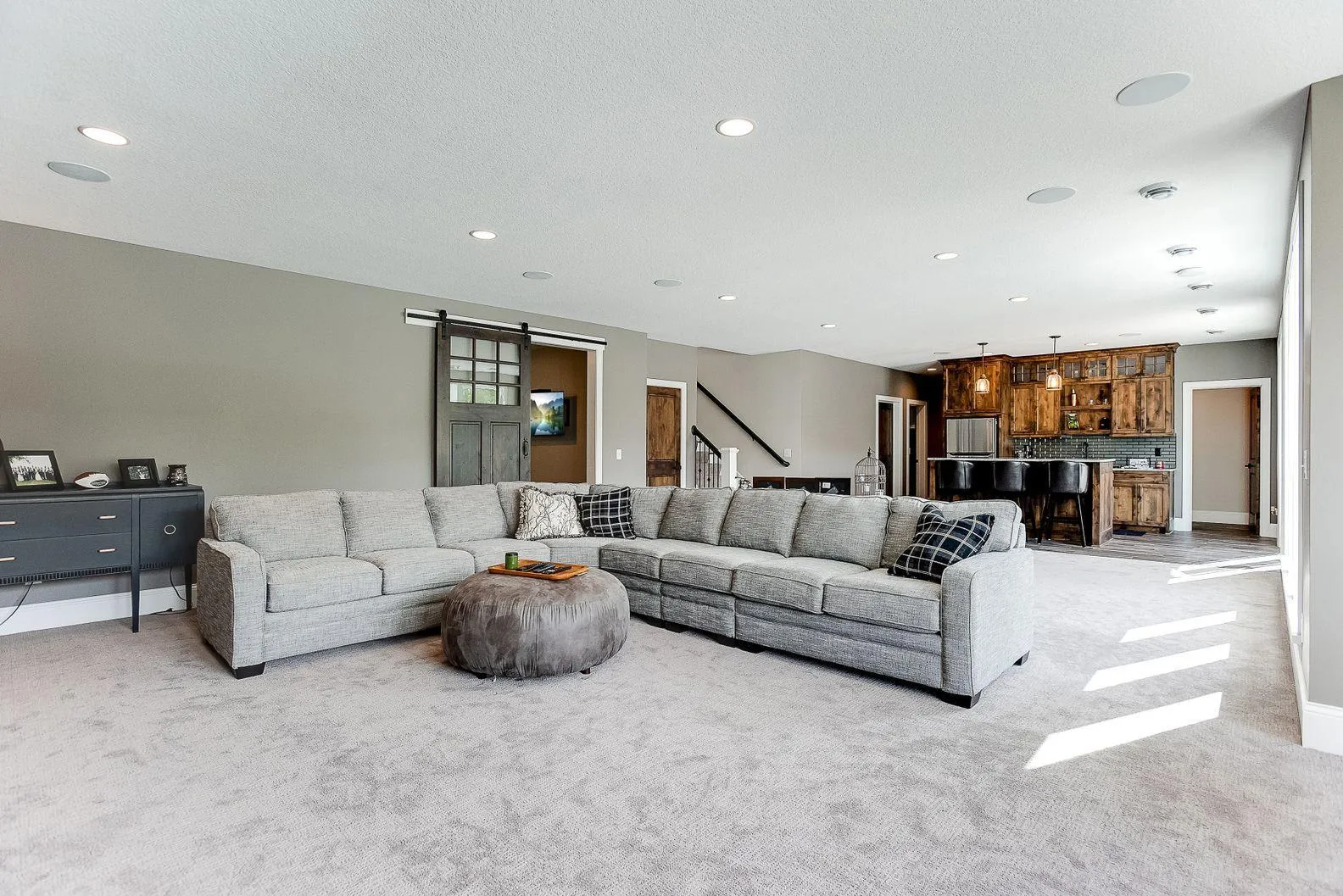 The finished lower level boasts 9′ ceilings, a spacious family room/rec room, wet bar, two additional bedrooms, a full bath, a large exercise room, and abundant storage space.