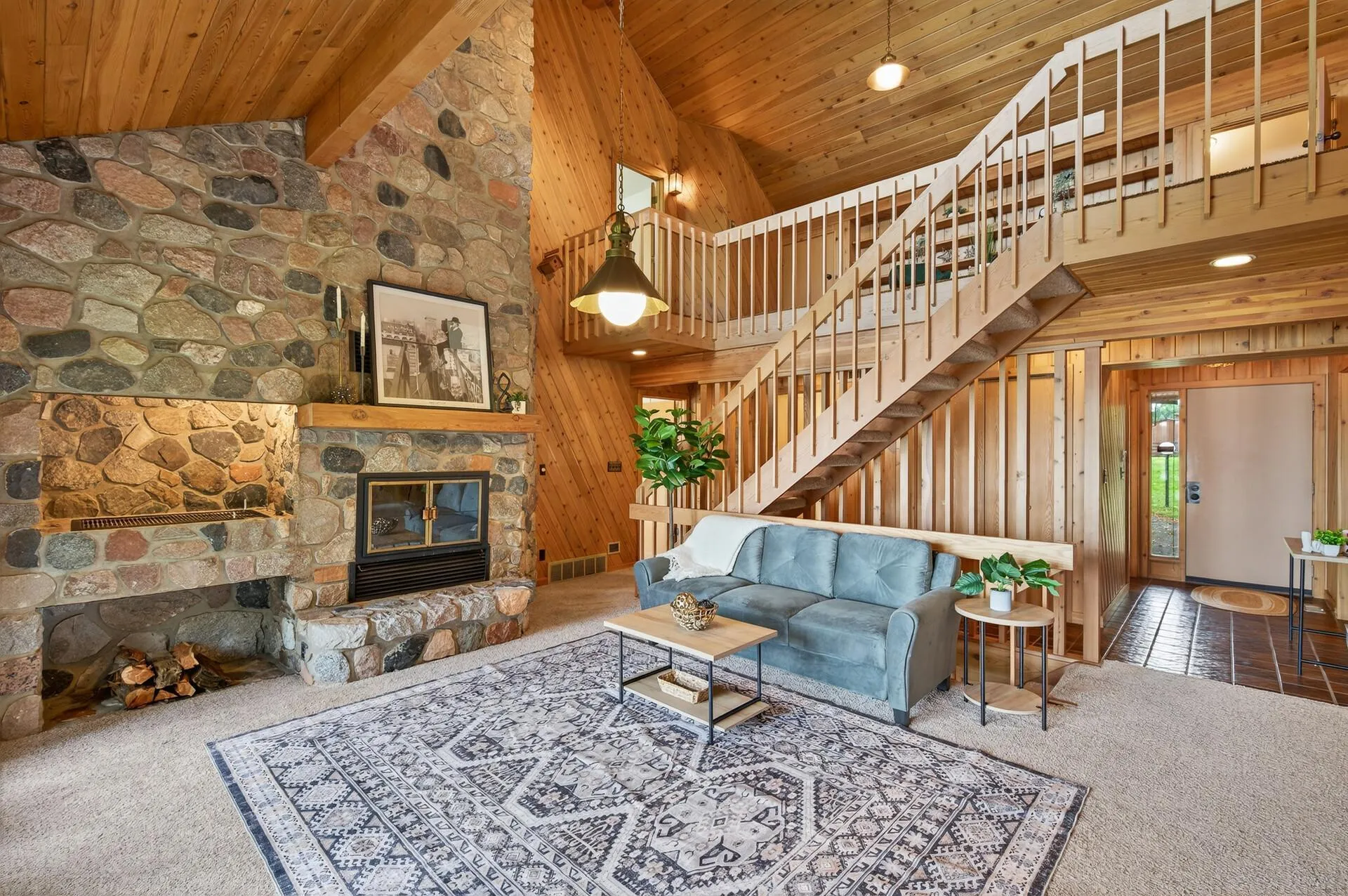 Inside, you’ll immediately notice the artistry that sets this home apart. Knotty pine walls, tongue-and-groove ceilings, and open railings create a grand and welcoming atmosphere. Mid-century modern windows frame panoramic views of School Lake’s natural beauty. The two-story stone hearth surrounding the wood-burning fireplace is truly a showpiece, and integrated lighting in the exposed beams highlights just how ahead of its time this design really is. The flexible layout is perfect for age-in-place living or accommodating multi-generational families, ensuring comfort and accessibility for every stage of life. The main level features a spacious primary bedroom with its own private deck, walk-in closet, and a private 3/4 bath. Upstairs, two generously sized bedrooms with vaulted ceilings are separated by a cozy loft with built-in bookshelves, offering lake views and a perfect spot to relax or read. The walk-out lower level adds even more versatility, with an additional bedroom, a family room with a wood burning stove, and a library or office space—ideal for book lovers, musicians, or as a fun game area. Outside, at the heart of the farm, stands a 2,353 sq ft barn, designed with every need in mind. Five spacious horse stalls, a dedicated horse shower, tack and feed rooms, and a walk-up attic for storage make daily chores efficient and enjoyable. The oversized three-car garage accommodates vehicles and trailers, while the 40 x 23 open shelter behind the barn keeps livestock content and protected, no matter the season. This property is a haven for both horse and cattle enthusiasts. The varied landscape helps with pasture rotation, protecting the land’s health and keeping your animals happy with plenty of grazing options. Blaze your own trails for riding or skiing, set out boating on the lake, or create the garden of your dreams—all without leaving your land.