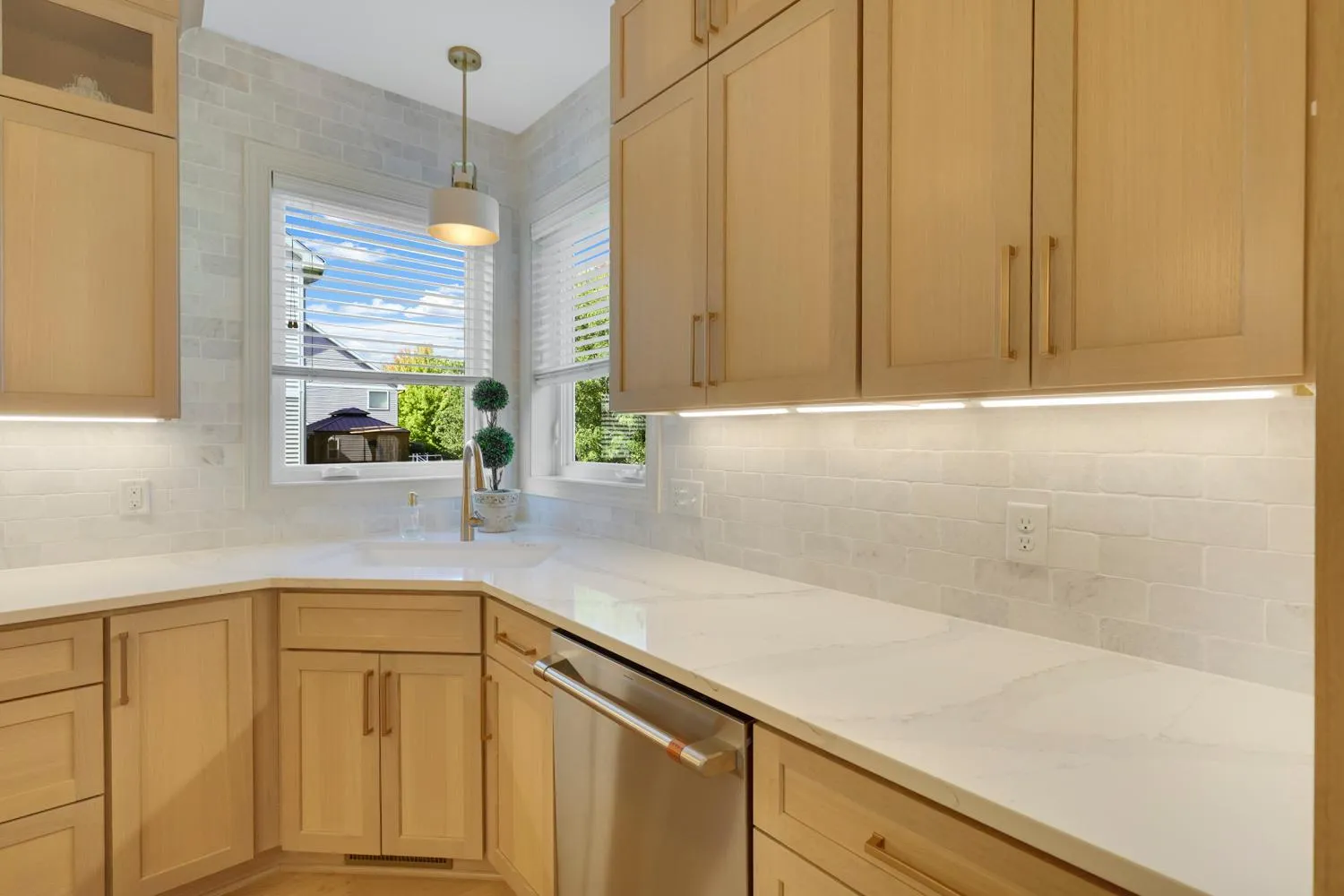 The heart of the home is the brand-new, July 2025 custom-built kitchen, showcasing stunning quartz countertops, Cafe Brand high-end appliances, custom white oak cabinetry, and a spacious island that’s ideal for gathering. A gorgeous butler’s pantry with custom tile adds both elegance and convenience, while designer lighting creates a warm, inviting atmosphere.