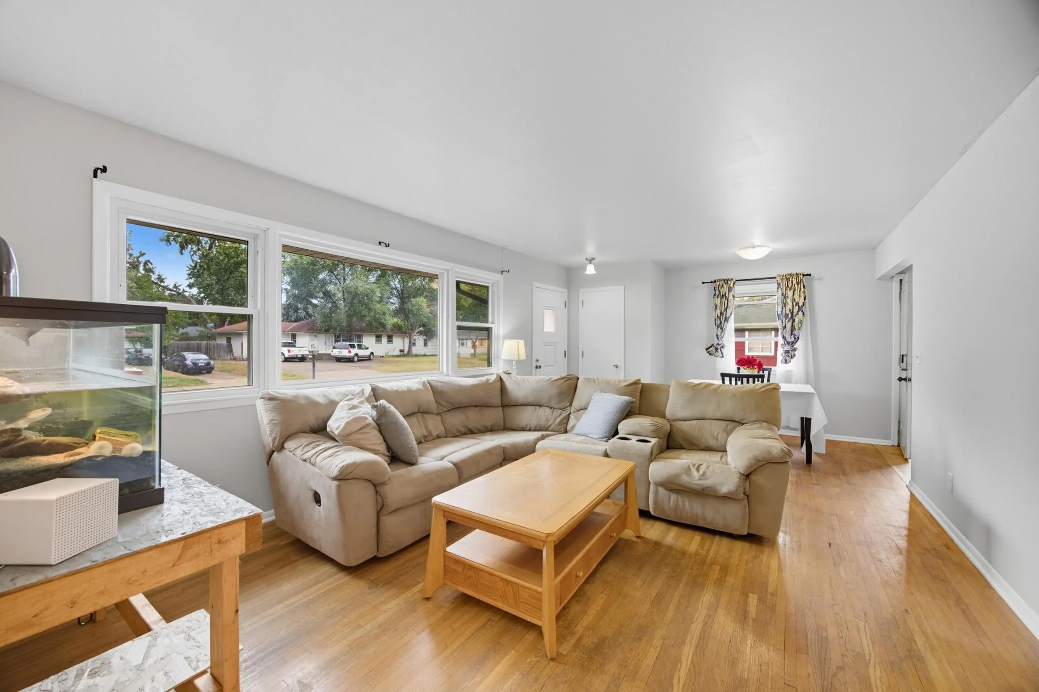 Step inside to find a bright living room with original hardwood floors and plenty of natural light. The kitchen features updated cabinetry, ample storage, and space for an eat-in dining area. Three main-level bedrooms provide flexible living arrangements, while the full bathroom includes a large vanity and built-in storage.