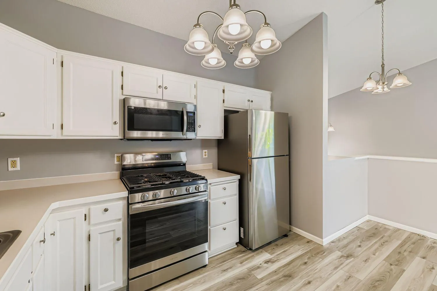 Nicely updated 2 bedroom, 2 bathroom, 2 car garage end-unit townhome! The main level has spacious living room leading out to private deck, kitchen with updated stainless steel appliances, large bedroom and full bathroom! The lower level has good sized family room with walk-out to patio area, bedroom and full bathroom! Newer paint, floor coverings & lights throughout! Quick close possible. Conveniently located near city parks, shopping, schools & highways! A must see!