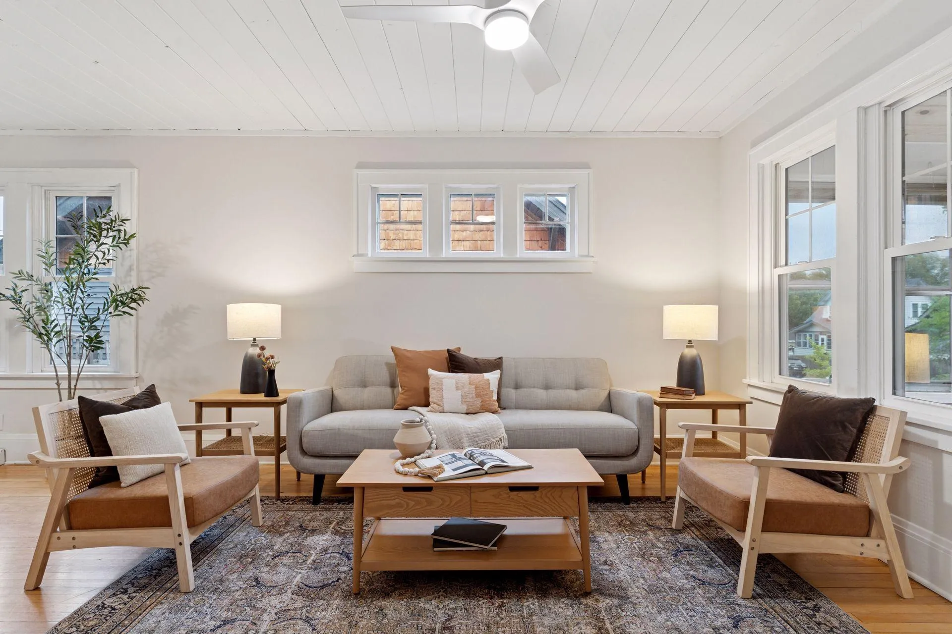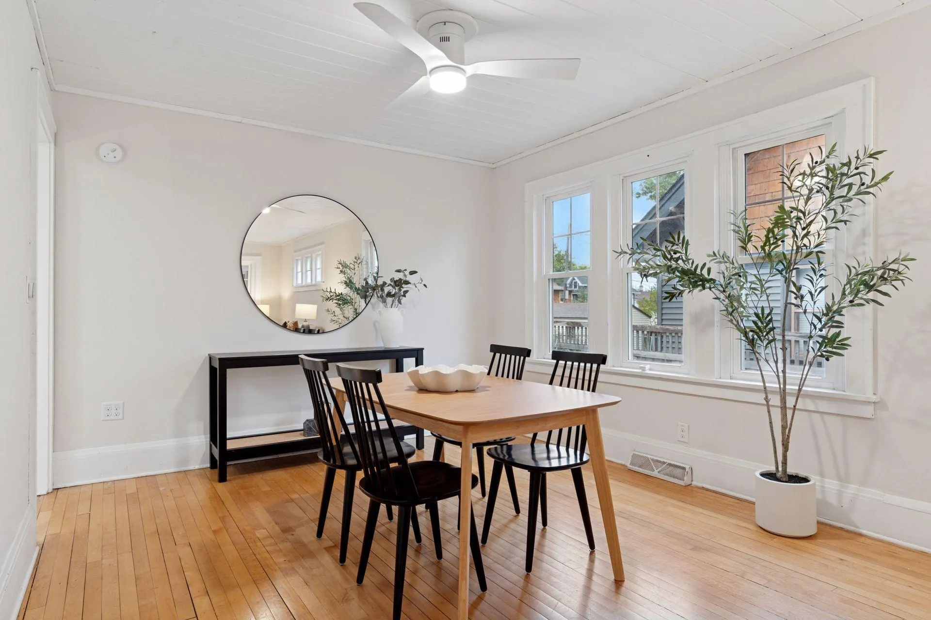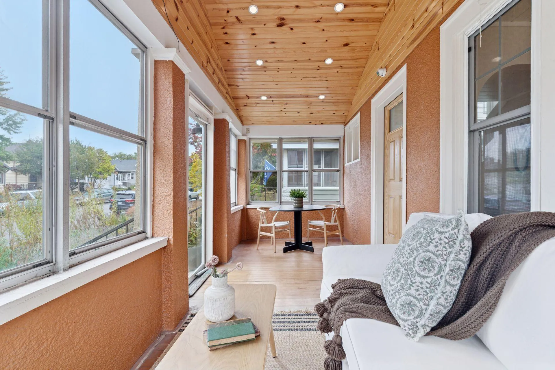 Welcome to this dynamic Three-Bedroom, Three Bath gem, brimming with a delightful blend of classic charm and fabulous updates, and located in a most convenient St. Paul neighborhood! The inviting front porch was remodeled in 2018 with a vaulted wood paneled ceiling with recessed lights and a breezy ceiling fan. Accented with windows on three sides, this is the ideal place to sit with your morning coffee and watch the seasons change. Step into the sun-drenched living room to find lovely hardwood floors and bright windows to bathe the space in natural light. One end is designed as an area for a formal dining room, featuring a ceiling fan and triple windows.
